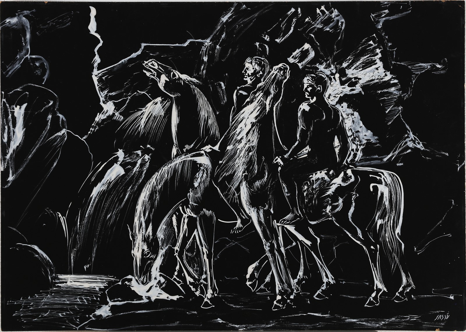 SASSU ALIGI (1912 - 2000) I cavalieri neri. 1961. Tempera su cartone. Cm 68,00 x 48,00. Firma in basso a destra. Al retro firma, titolo e anno. Opera archiviata presso l'Archivio Aligi Sassu come documentazione fotografica allegata all'opera riportante il relativo numero di inventario.