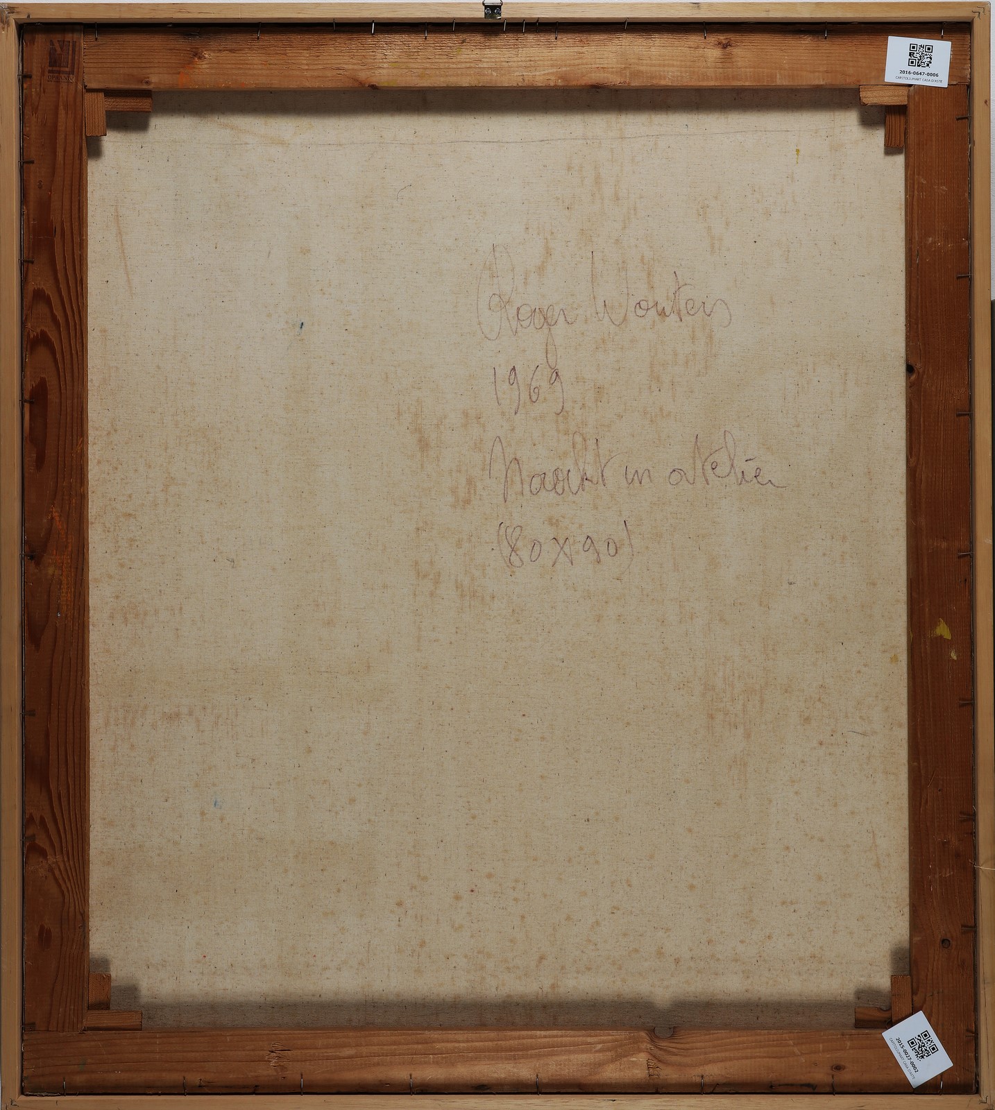 ROGER WOUTERS (n. 1937) Noracht in Atelier. . 1969. Acrilico su tela. Cm 80,00 x 90,00. Al retro firma, titolo e anno. . Cornice presente
