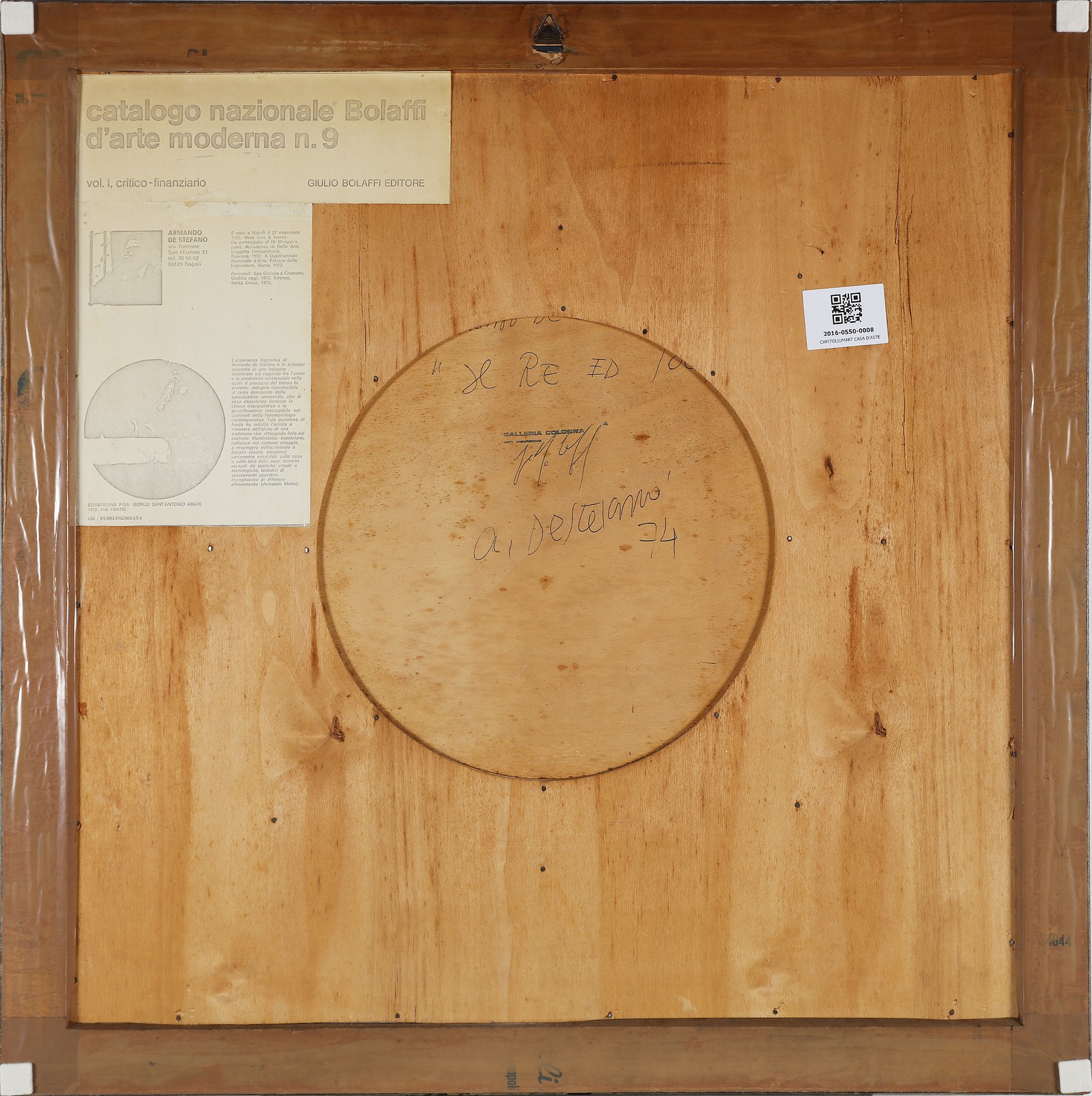 DE STEFANO ARMANDO (n. 1926) Il re ed io. . 1974. Olio su tela. Cm 50,00 x 50,00. Firma e anno in alto a destra. Al retro firma, titolo e anno. Al retro pubblicazione: catalogo nazionale Bolaffi Arte Moderna n.9, Volume I critico finanziario, Giulio Bolaffi Editore, p. 132. . Cornice presente
