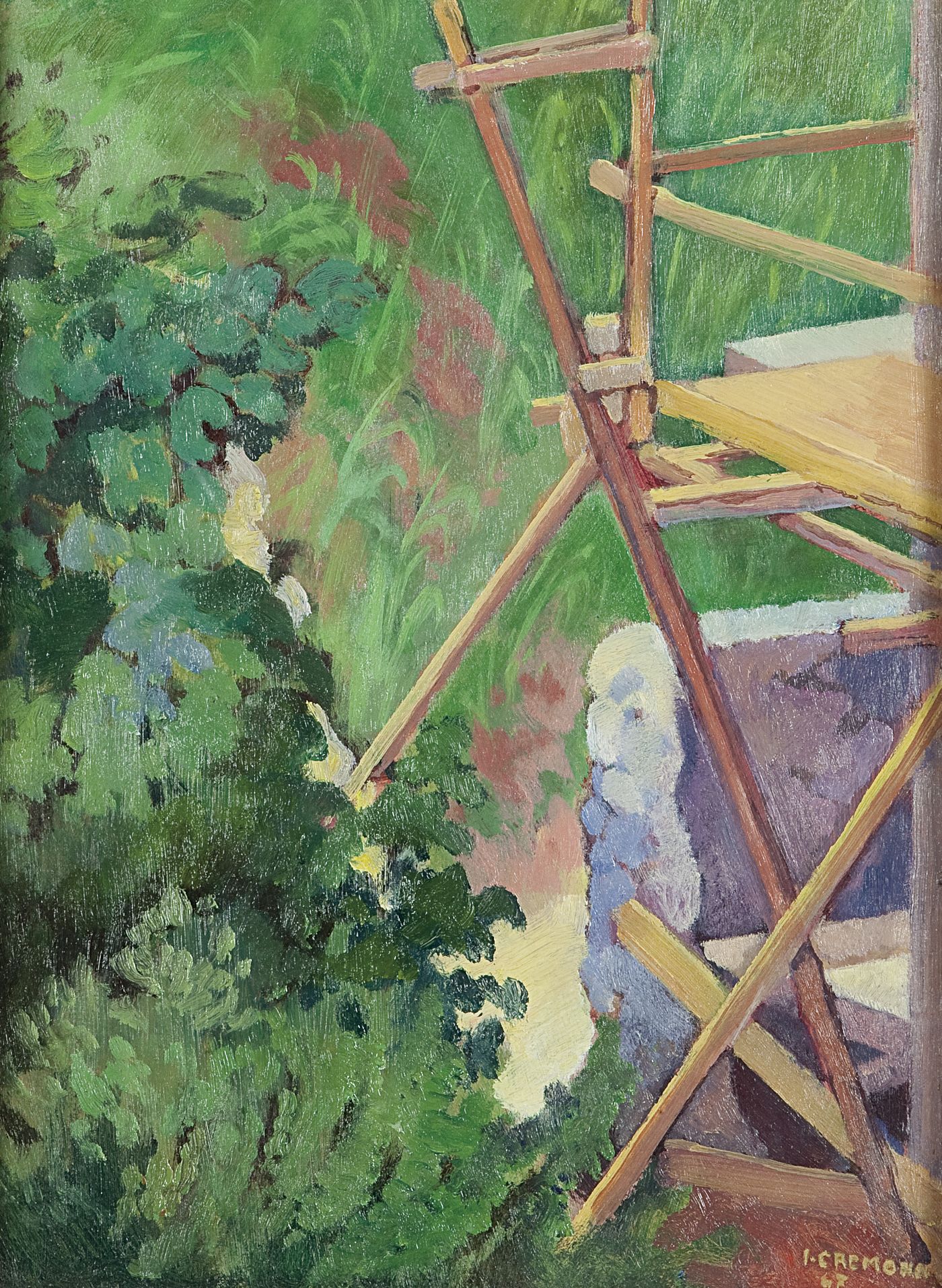 CREMONA ITALO Cozzo Lomellina (PV) 1905 - 1979 Torino "Impalcatura" 1967 28,5x21 olio su tavoletta Opera firmata e datata in basso a destra Già Premio Nazionale di Pittura "Targa d'oro Galleria Estense" (etichetta al retro) Già Galleria Carlo Alberto, Torino (etichetta al retro)