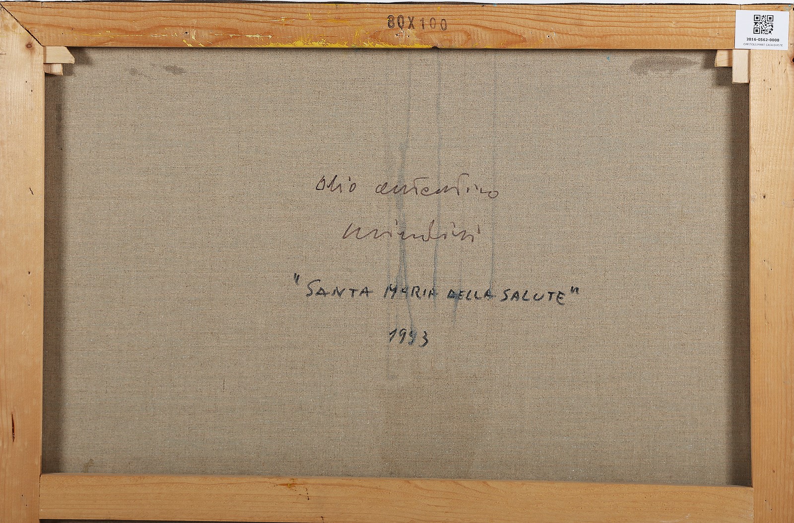 BRINDISI REMO (1918 - 1996) Santa Maria della Salute. . 1993. Olio su tela. Cm 100,00 x 80,00. Firma in basso a destra. Al retro titolo, firma per autentica e anno. Opera archiviata presso la Galleria d'Arte Pace, Milano, come documentazione fotografica allegata all'opera riportante il relativo numero di inventario. Pubblicazione: Catalogo Generale delle Opere del Maestro Remo Brindisi, Secondo Volume, p. 363 e 374, Galleria Pace, Milano. Cornice presente