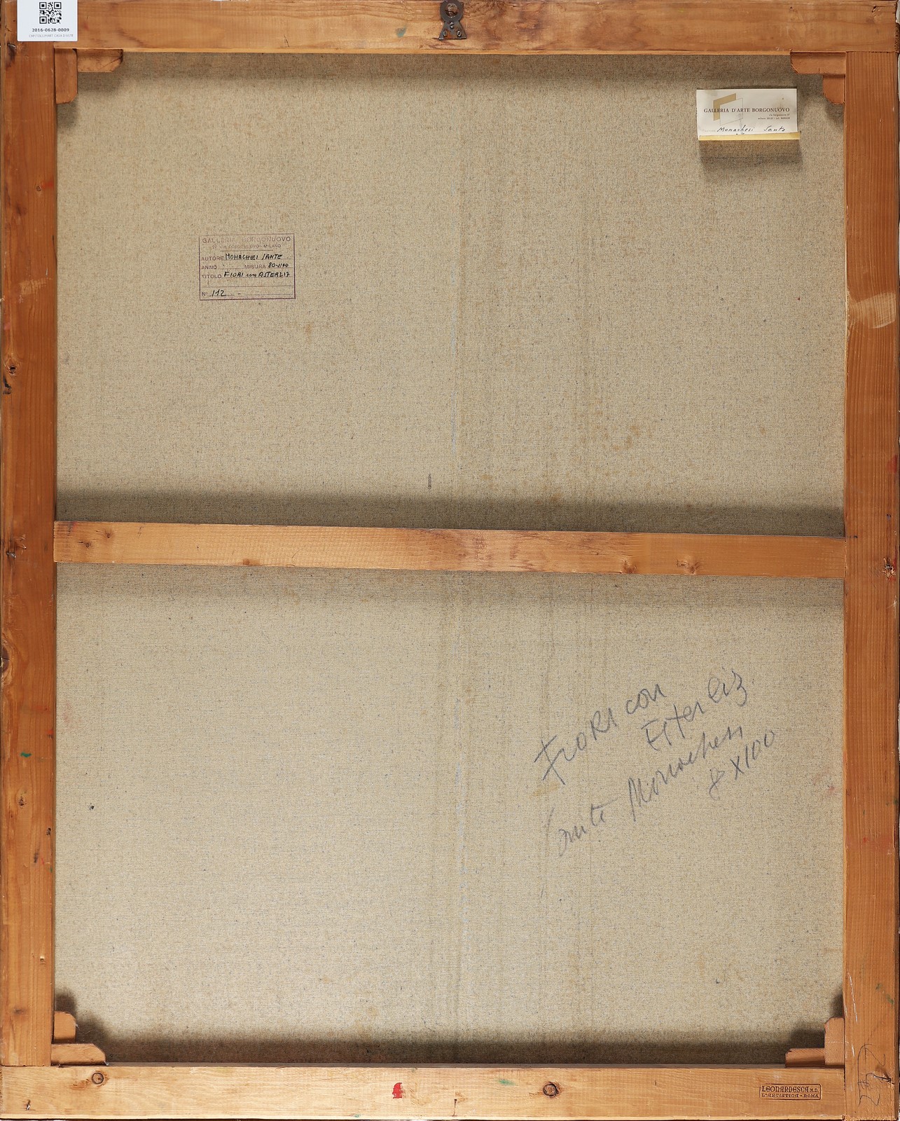 MONACHESI SANTE (1910 - 1991) Fiori. . Olio su tela. Cm 80,00 x 100,00. Firma in basso a destra. Al retro cartiglio descrittivo e timbro a cura della Galleria d'Arte Borgonuovo, Milano.