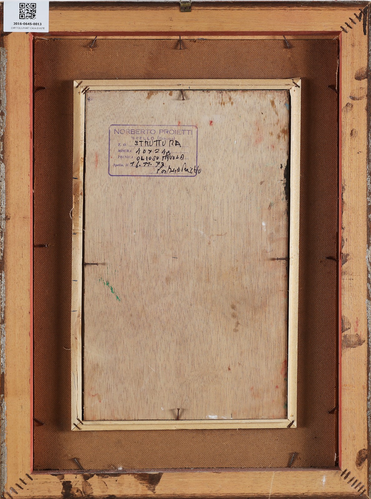 PROIETTI NORBERTO (1927 - 2009) Struttura. 1973. Olio su tavola. Cm 25,00 x 40,00. Firma e anno in basso a destra. Al retro timbro descrittivo dello studio Norberto Proietti di Spello (Perugia). Cornice presente