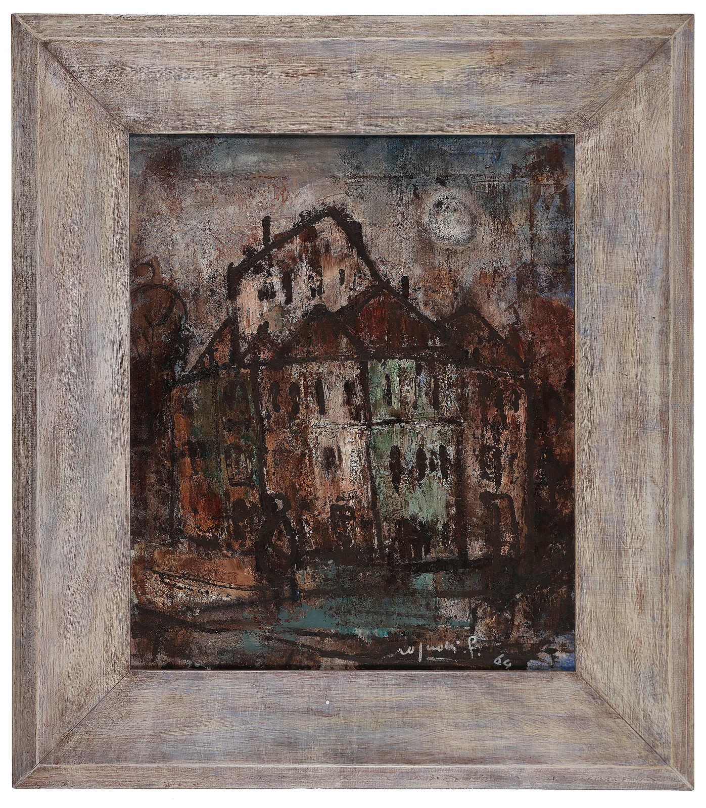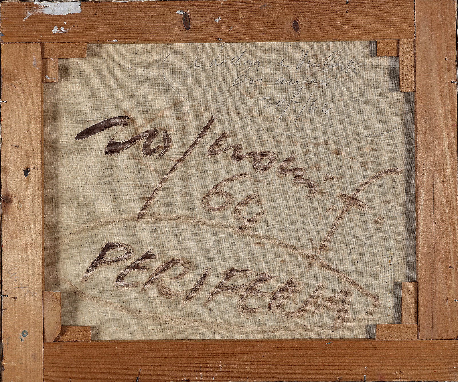 ROGNONI FRANCO (1913 - 1999) Periferia. . 1964. Olio su tela. Cm 46,00 x 54,50. Firma, titolo, anno e dedica al retro. Autentica su fotografia a cura di mariuccia Rognoni Noè. Certificato di garanzia e autenticità a cura della Meeting Art Casa D'Aste. . Cornice presente