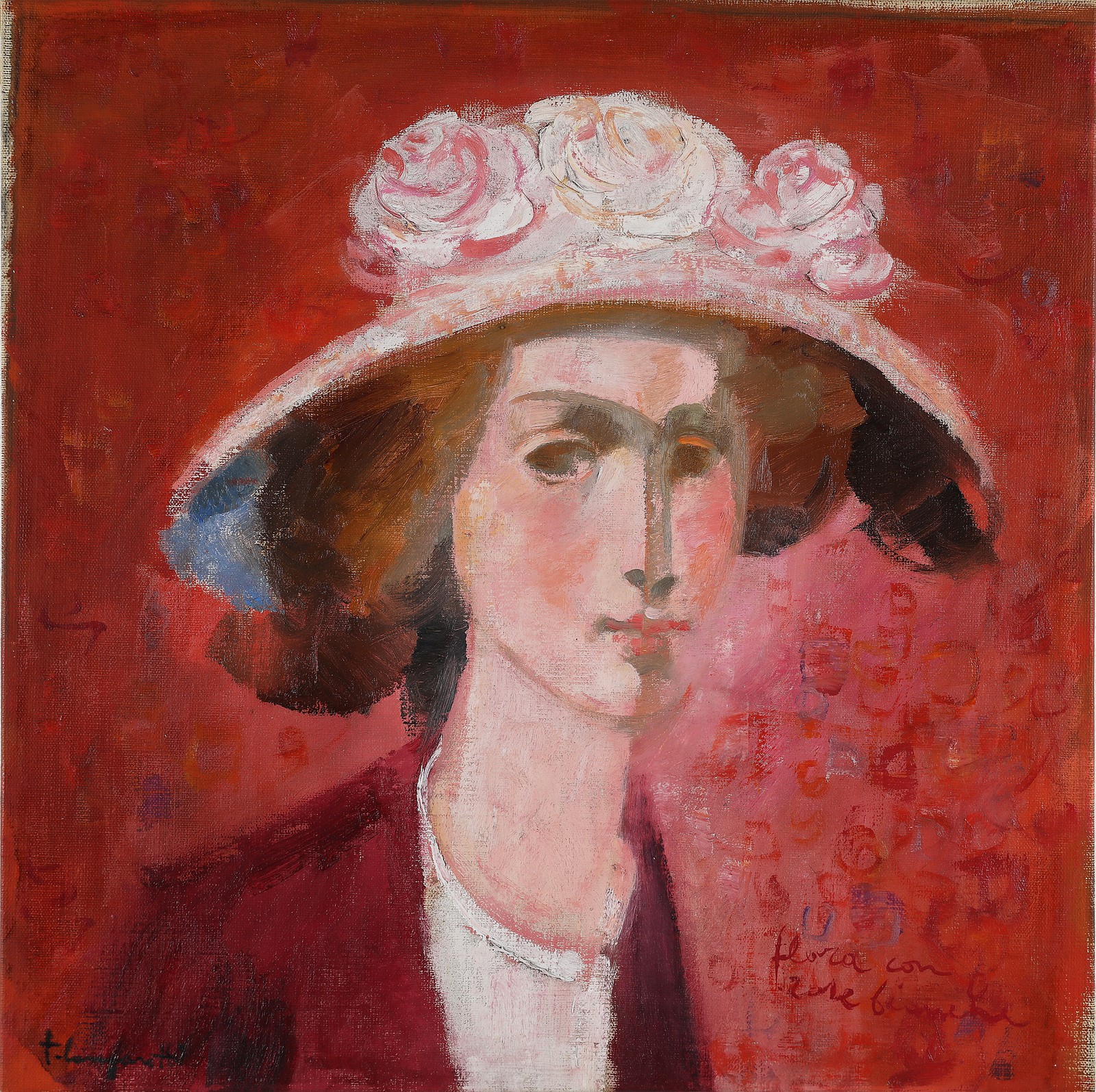LONGARETTI TRENTO (n. 1916) Flora con rose bianche. . 1985. Olio su tela. Cm 50,00 x 50,00. Firma in basso a sinistra, titolo in basso a destra. Al retro titolo, firma e anno. Opera archiviata presso l'archivio Trento Longaretti Bergamo come da fotografia allegata all'opera riportante il relativo numero di inventario. Provenienza Galleria Adda Capriate S.G. Bergamo. Fotografia riportante il maestro e la modella davanti all'opera durante la manifestazione "La modella per l'arte", Acqui Terme 1985 (IX edizione) lettera accompagnatoria scritta di pugno dal maestro indirizzata al curatore Paolo Vassallo. Pubblicazione: Unione Italiana Ristoratori, I ristoranti dell'arte, p. 49 (allegata all'opera).