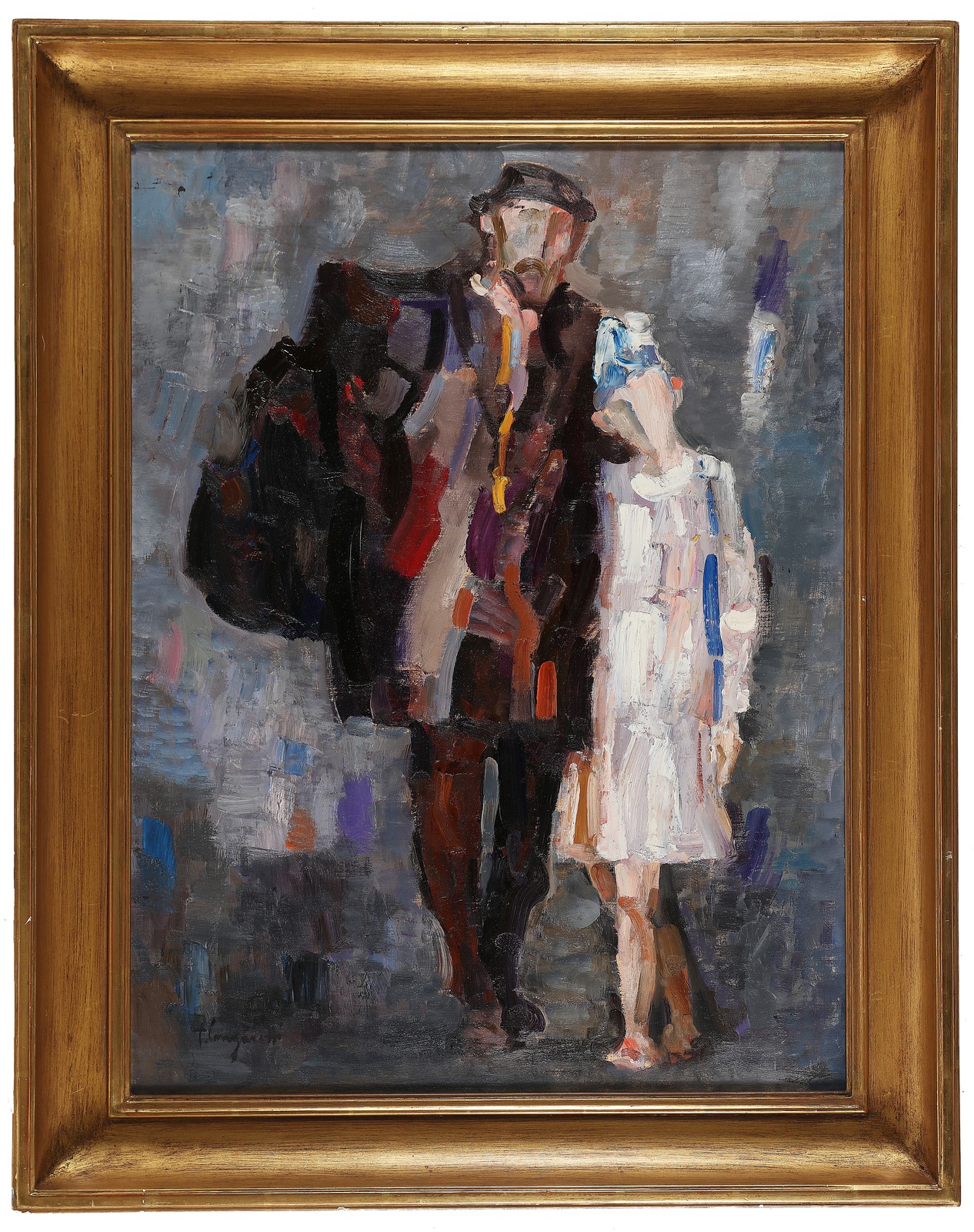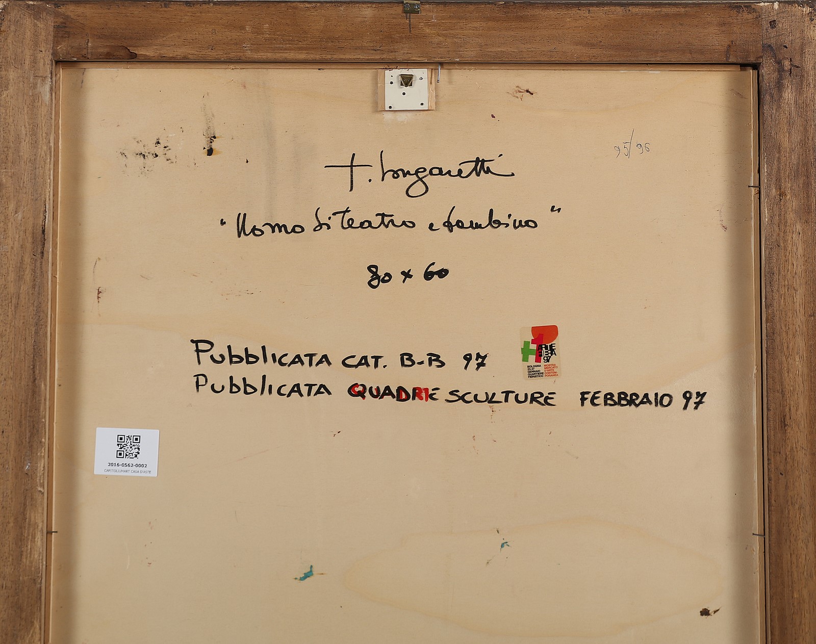 LONGARETTI TRENTO (n. 1916) L'uomo di teatro e il bambino. . Olio su tavola. Cm 60,00 x 80,00. Firma in basso a sinistra. Al retro firma e titolo. Autentica su fotografia a cura dell'artista. Anni '90. Cornice presente