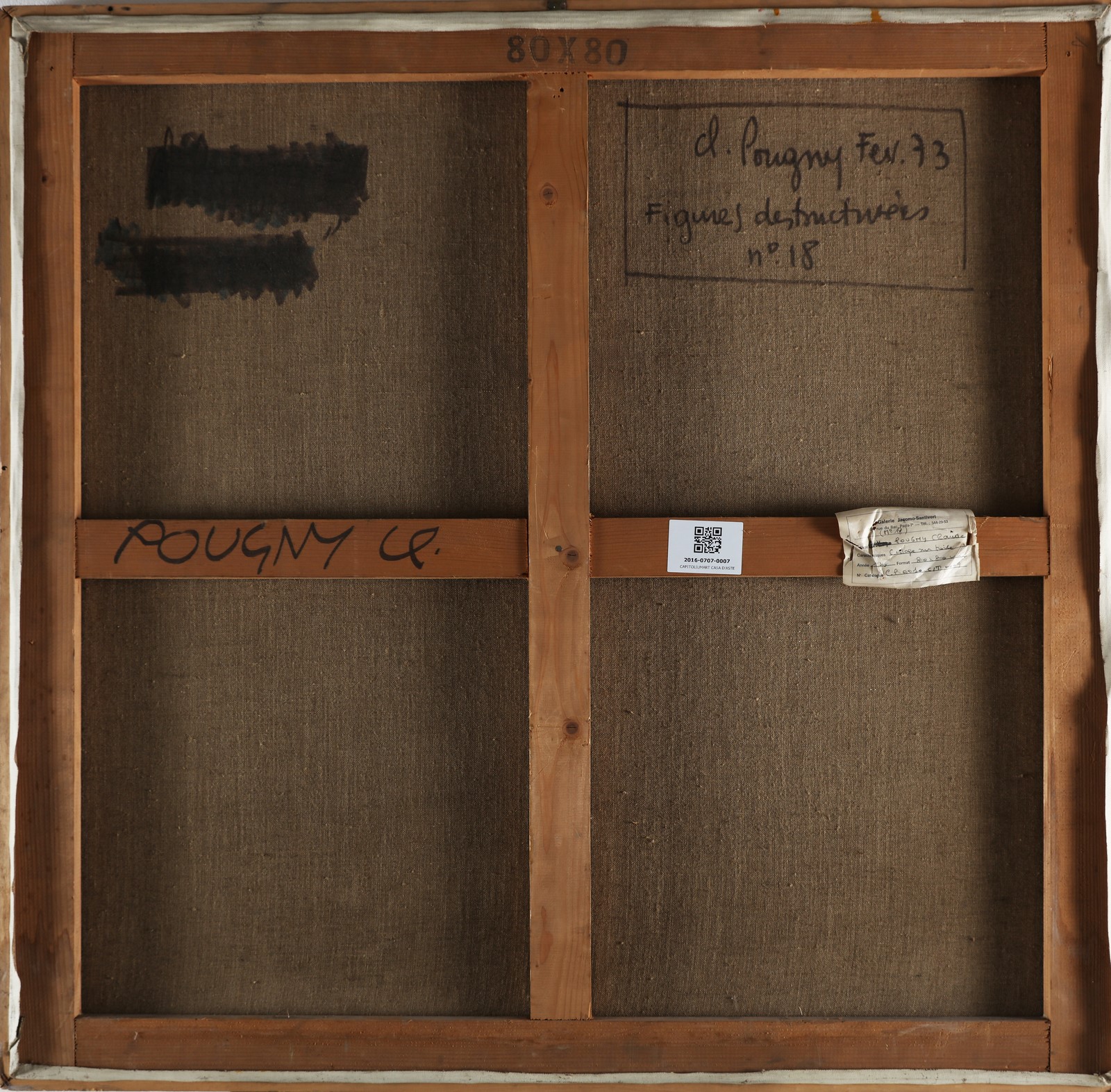 POUGNY CLAUDE (n. 1945) Figures destructives n. 18. . Tecnica mista e collage su tela. Cm 80,00 x 80,00. Firma e anno in basso a destra. Al retro firma, anno e titolo. Cartiglio descrittivo a cura di Galerie Jacomo-Santiveri, Parigi. . Cornice presente