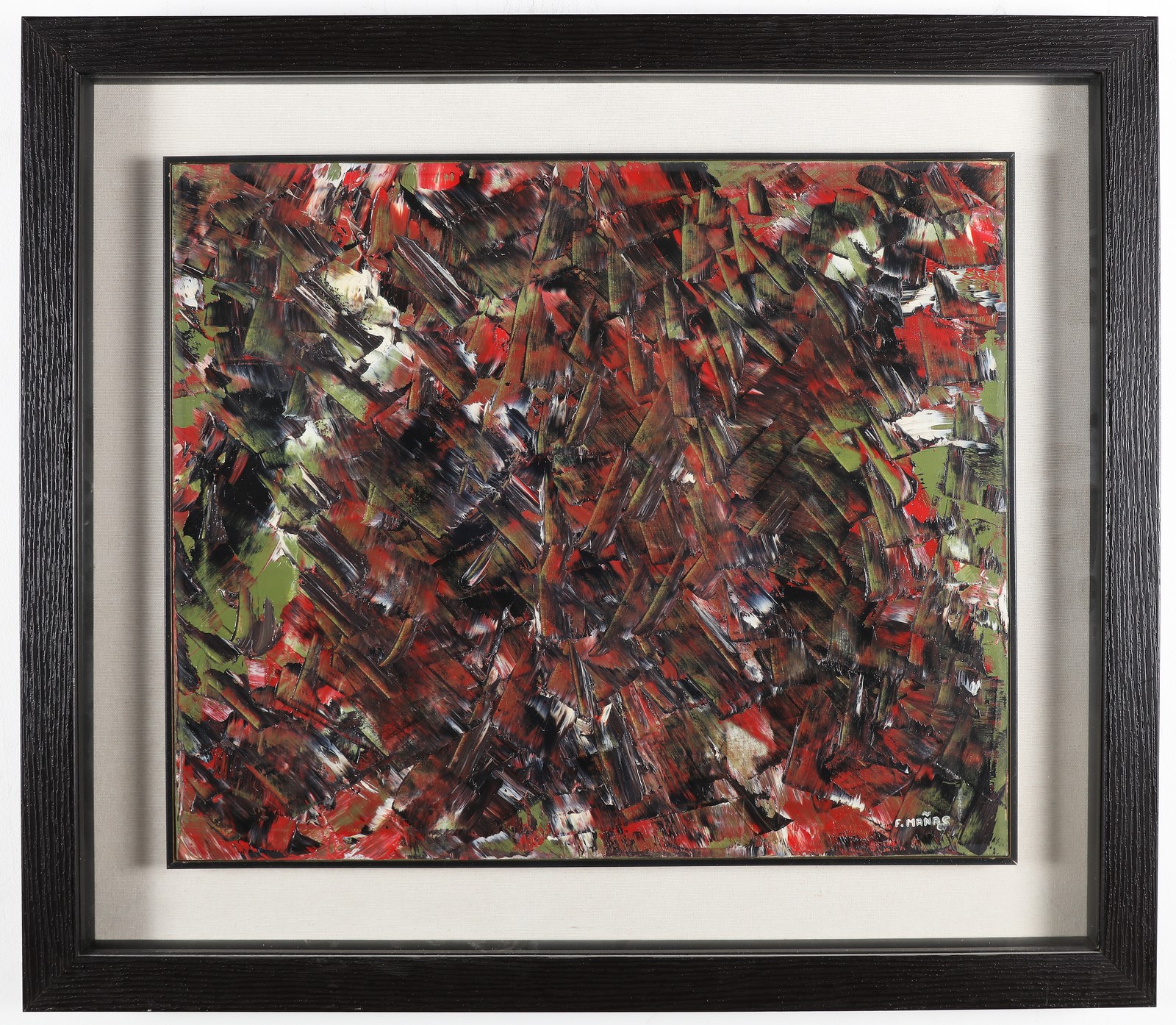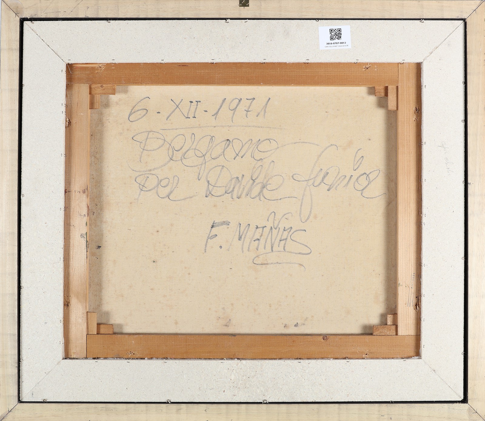 MANAS FRANCISCO (n. 1942) Senza titolo. . 1971. Tecnica mista su tela. Cm 60,00 x 50,00. Firma in basso a destra. Al retro firma, anno e dedica.
