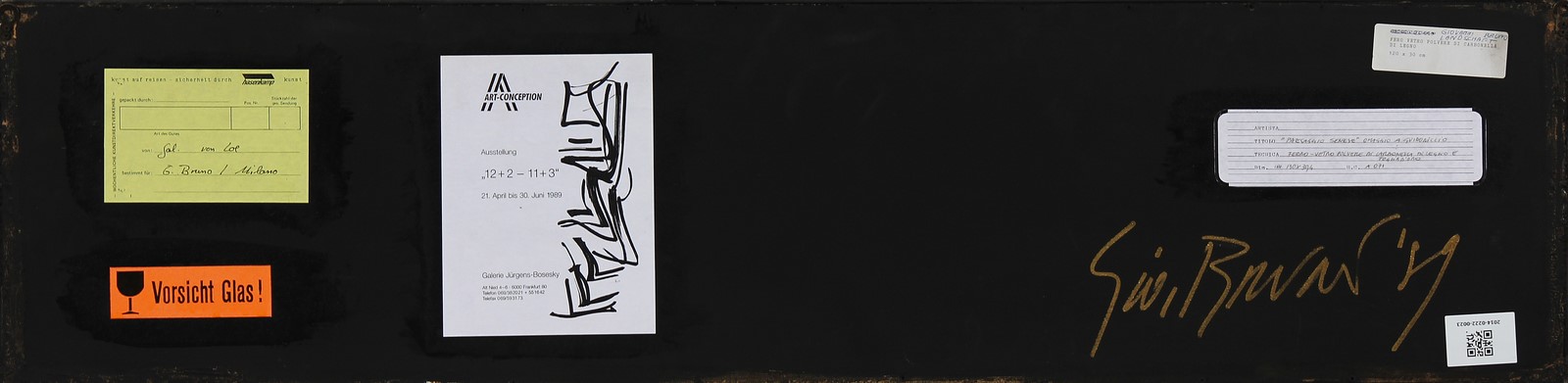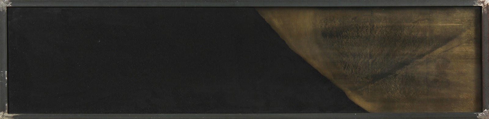 BRUNO GIOVANNI (n. 1961) Paesaggio Senese, omaggio a Guido Riccio. Ferro,vetro polvere di carbonella, legno e foglia d'oro. Cm 30,40 x 130,00. Al retro cartiglio descrittivo, etichetta Mostra Art-Conception Galerie Jurgens-bosesky , Francoforte, firma per autentica.