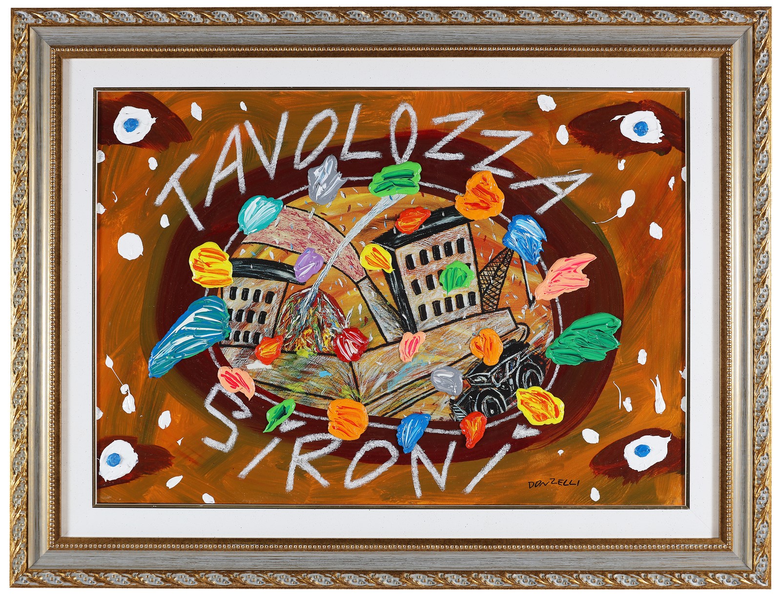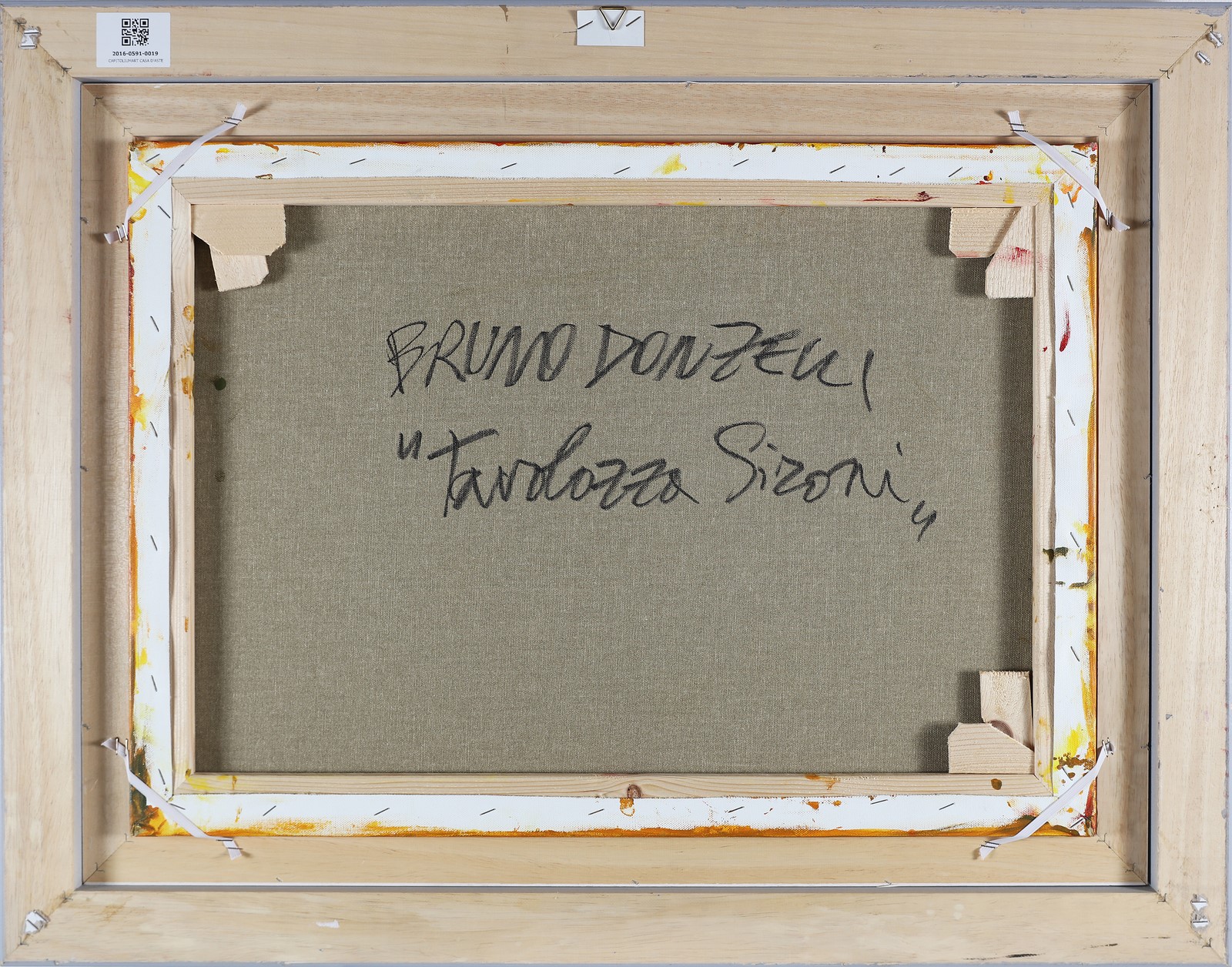 DONZELLI BRUNO (n. 1941) Tavolozza Sironi. . Olio su tela. Cm 70,00 x 50,00. Titolo e firma. Al retro titolo e firma. Autentica su fotografia a cura dell'artista. . Cornice presente