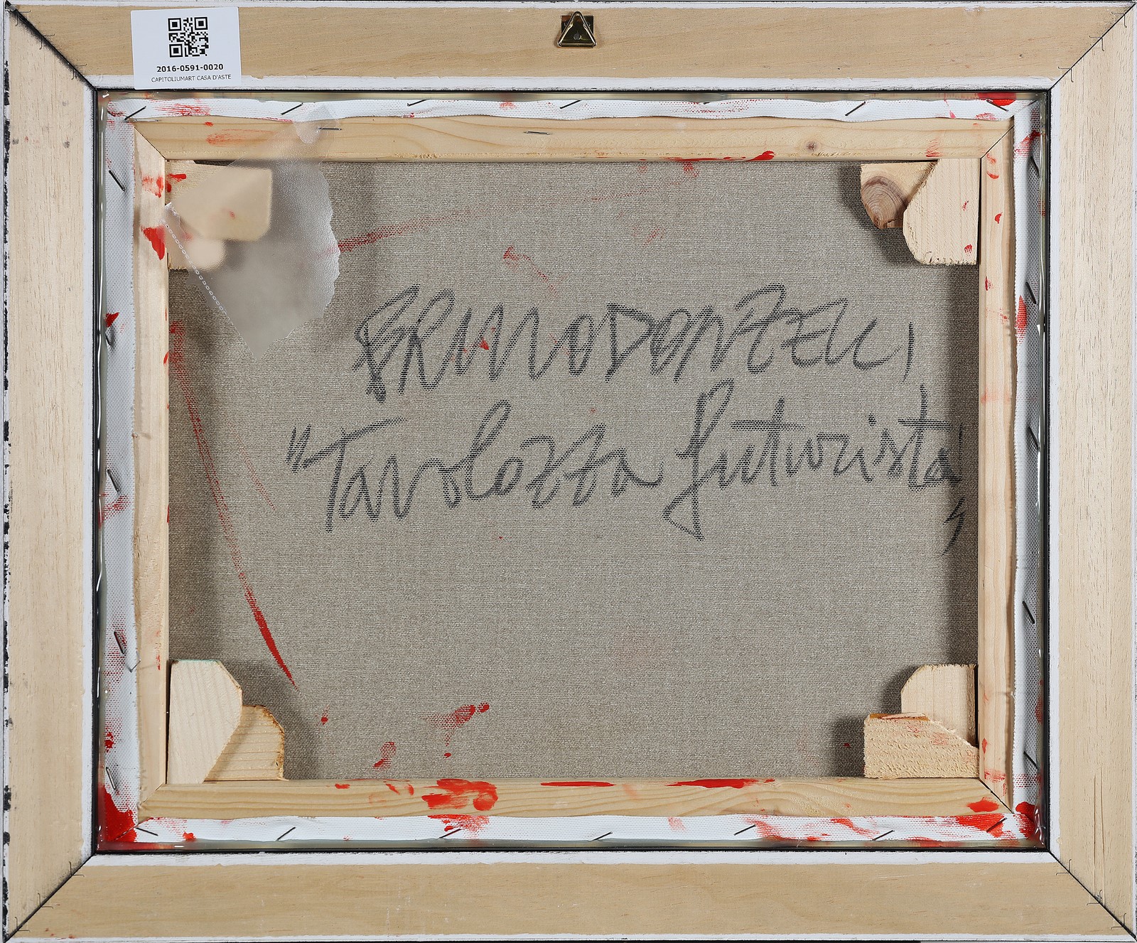DONZELLI BRUNO (n. 1941) Tavoletta futurista. . Olio su tela. Cm 50,00 x 40,00. Firma e titolo. Al retro firma e titolo. Autentica su fotografia a cura dell'artista. . Cornice presente