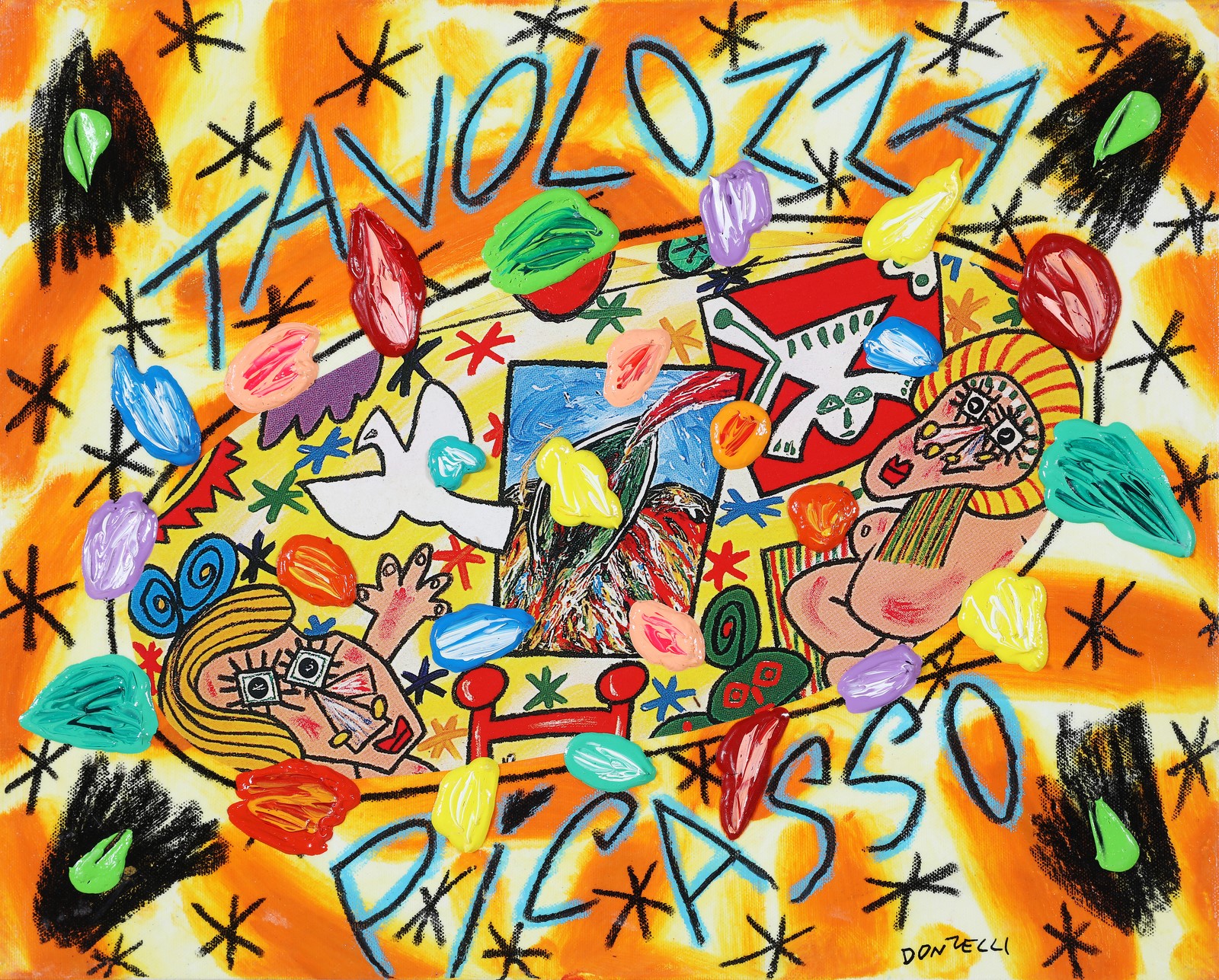 DONZELLI BRUNO (n. 1941) Tavolozza Picasso. Tecnica mista su tela. Cm 50,00 x 40,00. Firma in basso a destra. Al retro titolo e firma. Autentica dell'artista su fotografia.