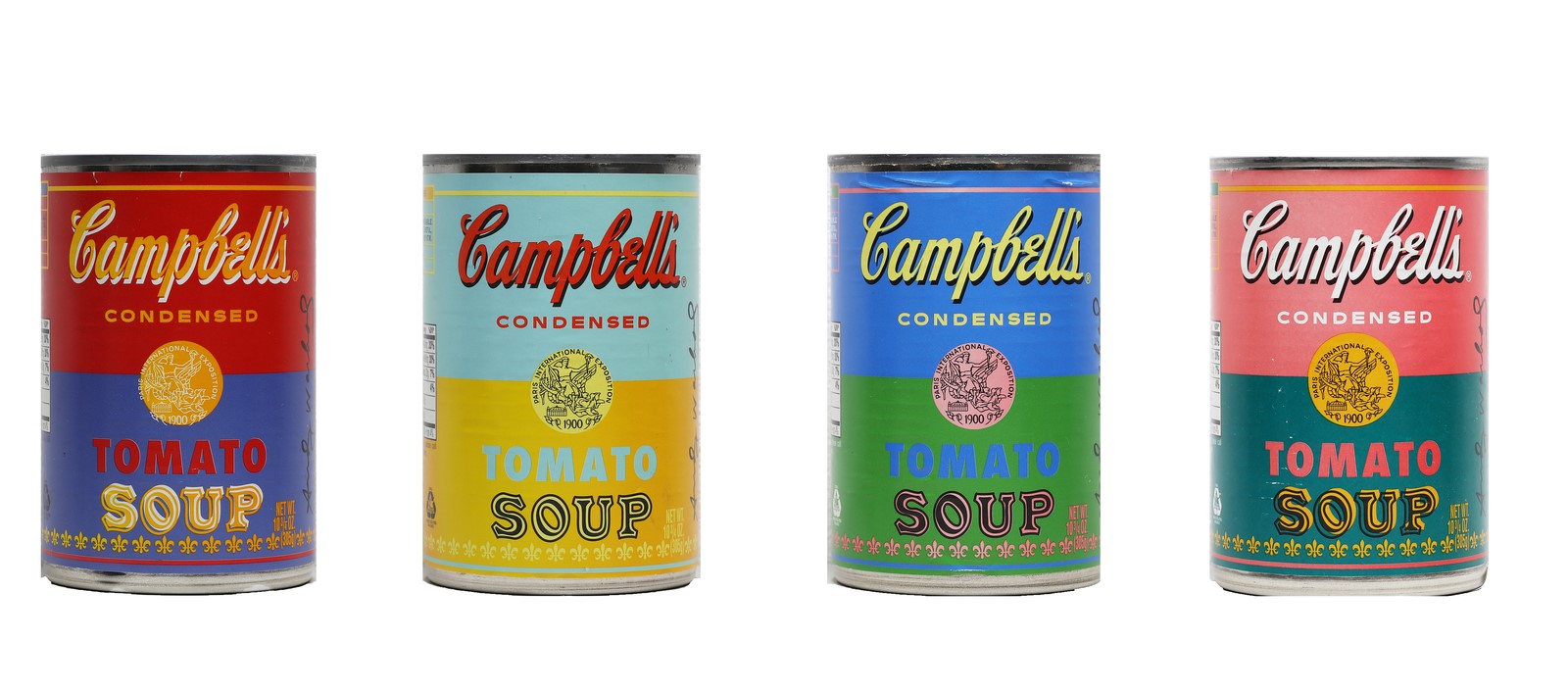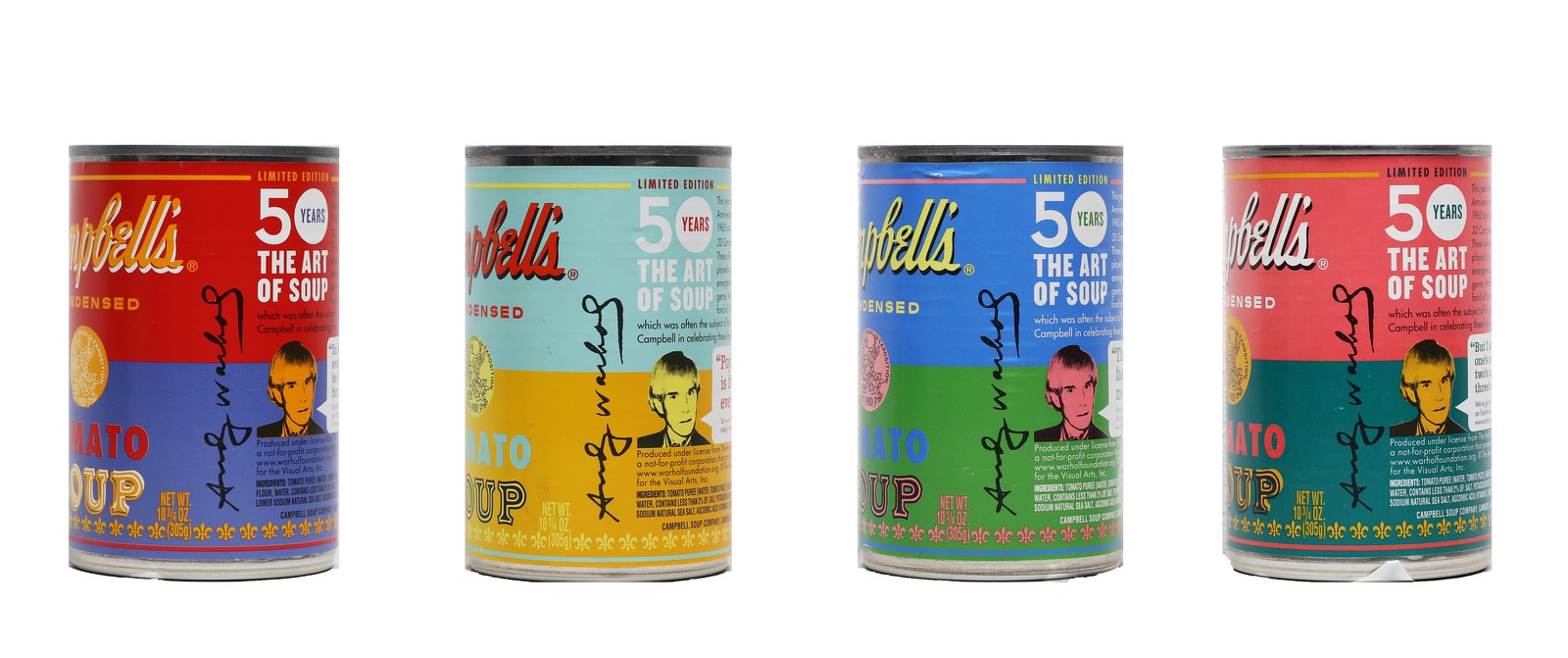 WARHOL ANDY (1928 - 1987) Campbell Soup. . Cartone e lattine. Cm 7,00 x 10,50. Limited edition, 50esimo anniversario. Firma a stampa. Lotto composto da quattro lattine.