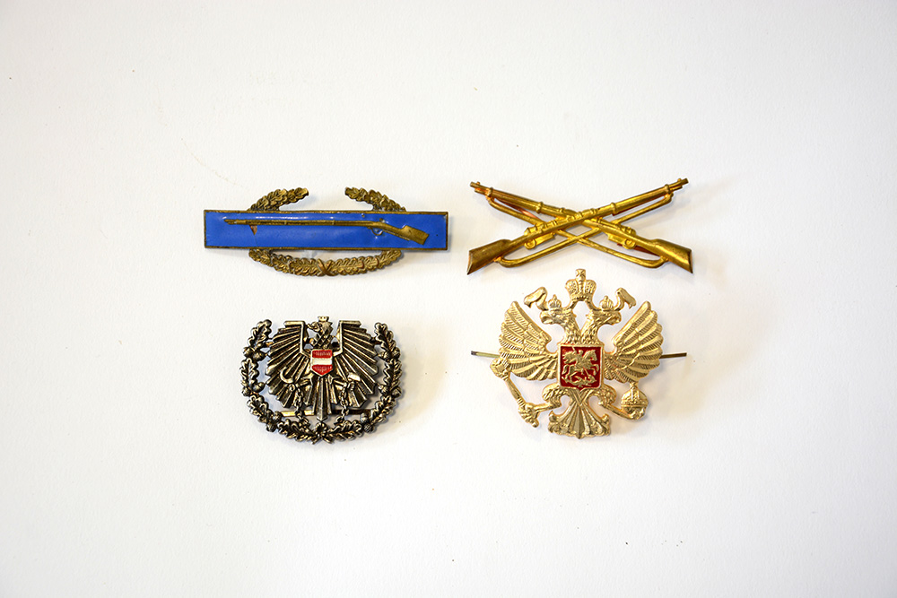 Lotto composto da tre fregi da uniforme e da un distintivo in metallo...
