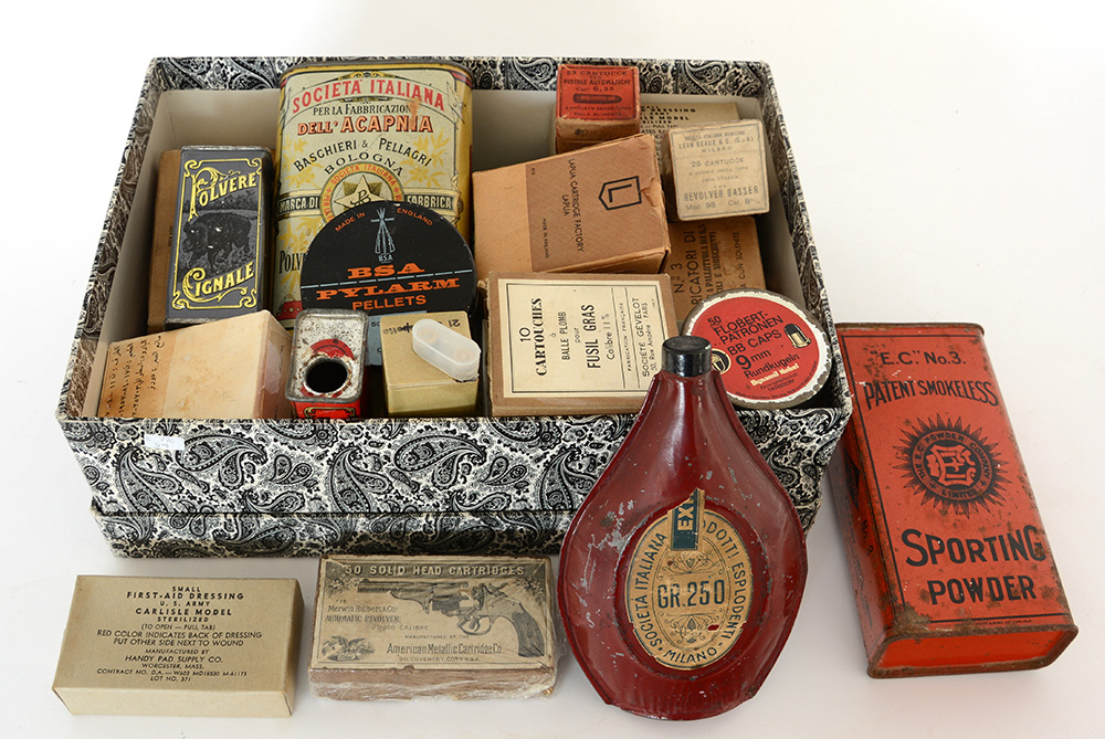 Scatola contenente diverse confezioni in carta di munizioni e in metallo di polvere da sparo