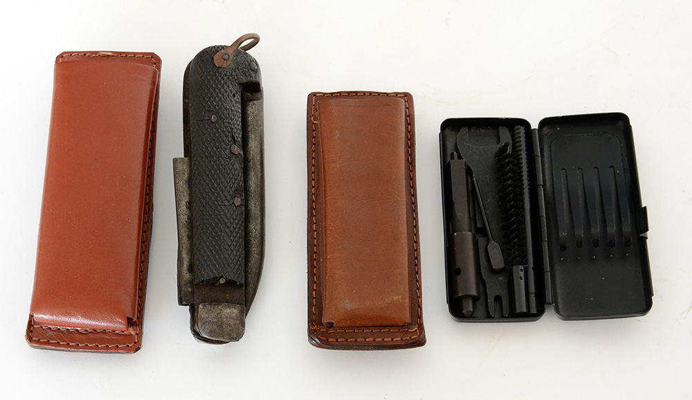 Lotto composto da una scatoletta contenente attrezzi per pulizia e manutenzione di pistola, due portacaricatori di automatica in pelle e da un coltellino multiuso della II Guerra Mondiale di produzione inglese con lama danneggiata