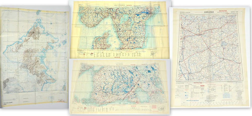 Lotto di quattro carte militari stampate su seta, in uso solo presso gli ufficiali