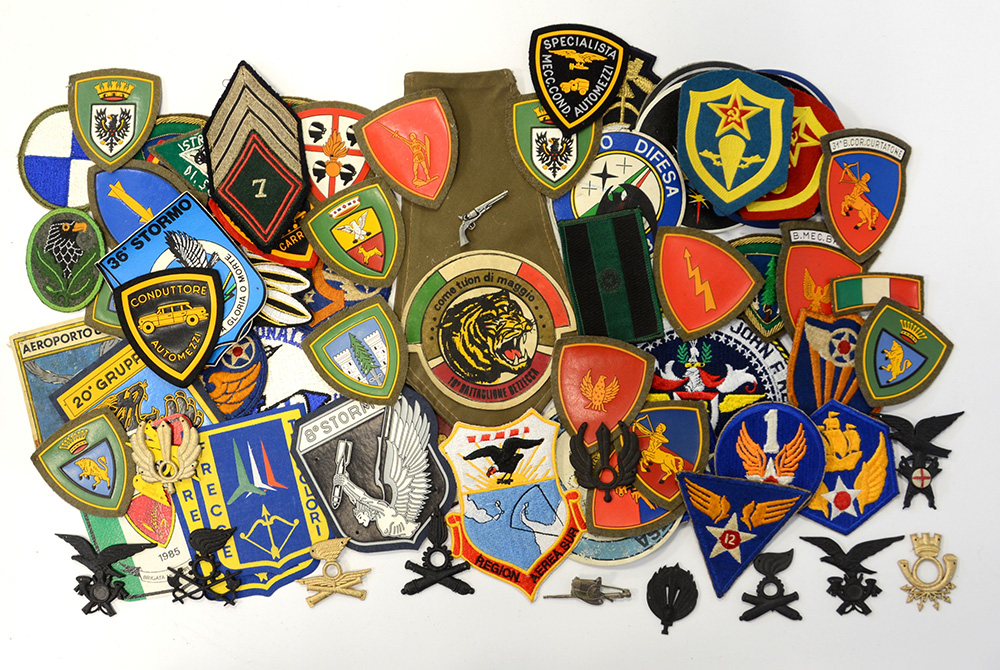 Lotto composto da numerosi scudetti da braccio in ricamo di svariati reggimenti italiani e alcuni di eserciti stranieri, cui si aggiungono fregi di specializzazione dell'Esercito Italiano in materiale plastico. In scatola di latta