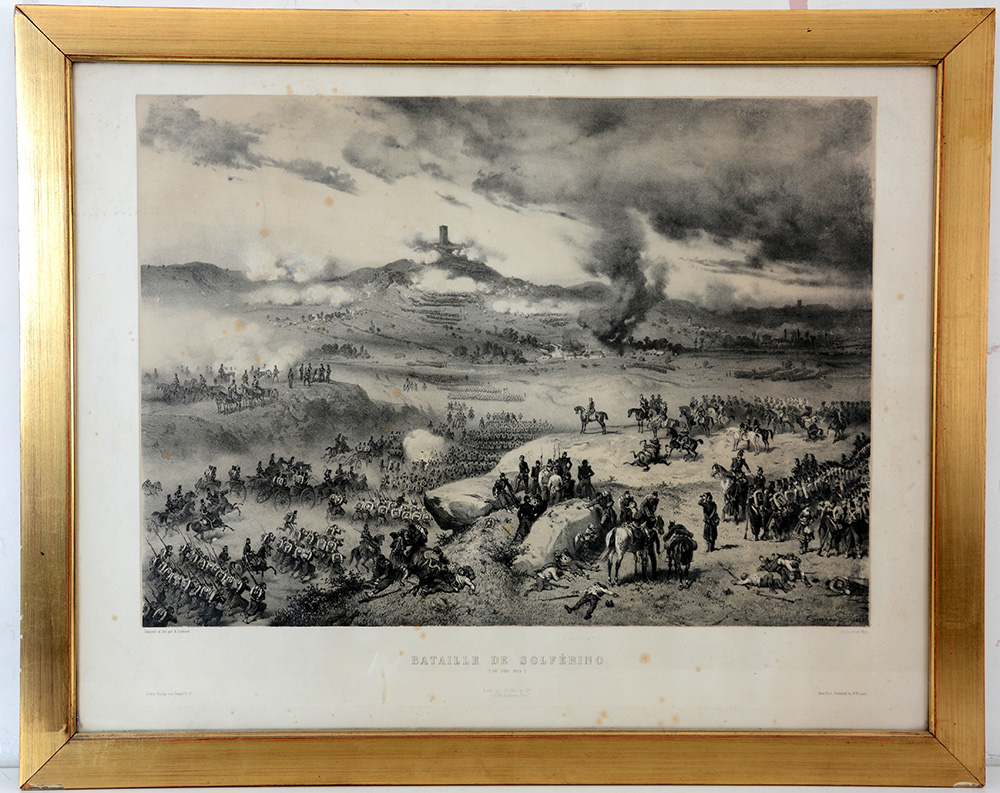 Grande litografia (cm 60x77) del secolo XIX, raffigurante il teatro della battaglia di Solferino. Opera di Guerard. In cornice