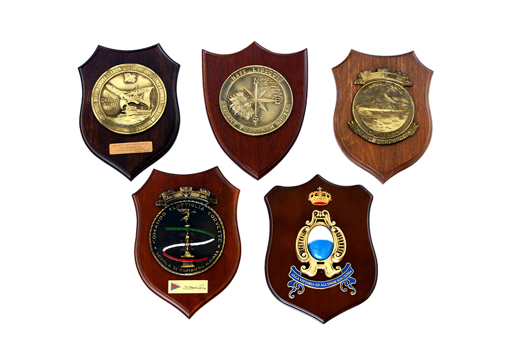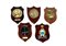 Lotto composto da cinque grandi crest (insegne reggimentali) in metallo smaltato su base lignea