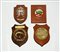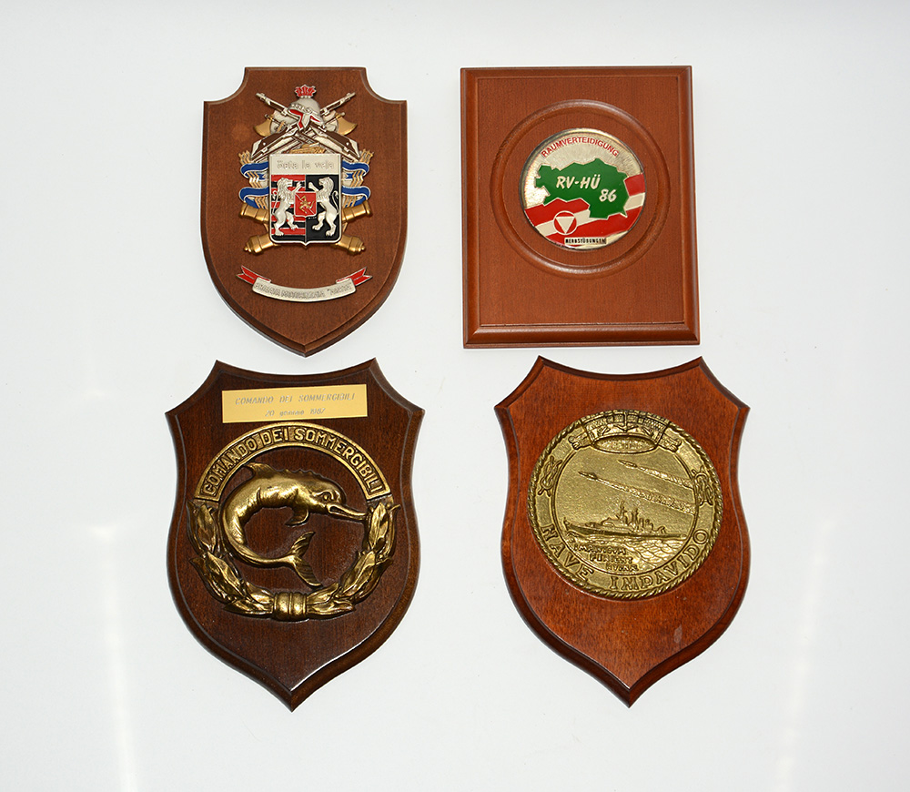 Lotto composto da quattro grandi crest (insegne reggimentali) in metallo smaltato su base lignea