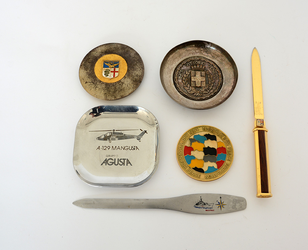 Lotto di due posaceneri (uno dell'incrociatore Vittorio Veneto), due fermacarte militari, pi˘ due tagliacarte della marina militare