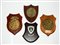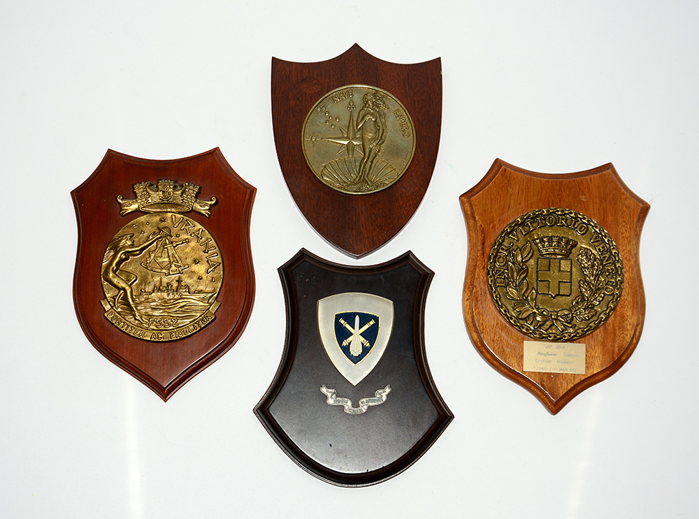 Lotto composto da quattro grandi crest (insegne reggimentali) in metallo smaltato su base lignea