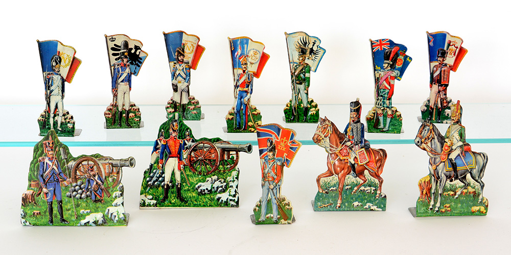 Lotto composto da otto soldatini portabandiera in lastra metallica a rilievo stampata (h cm 10), a cui si aggiungono due artiglieri con cannone (h cm 10) e due a cavallo (h cm 11). Epopea napoleonica. Marca Brivio di Milano, anni '60. Buono stato di conservazione (lievi difetti)