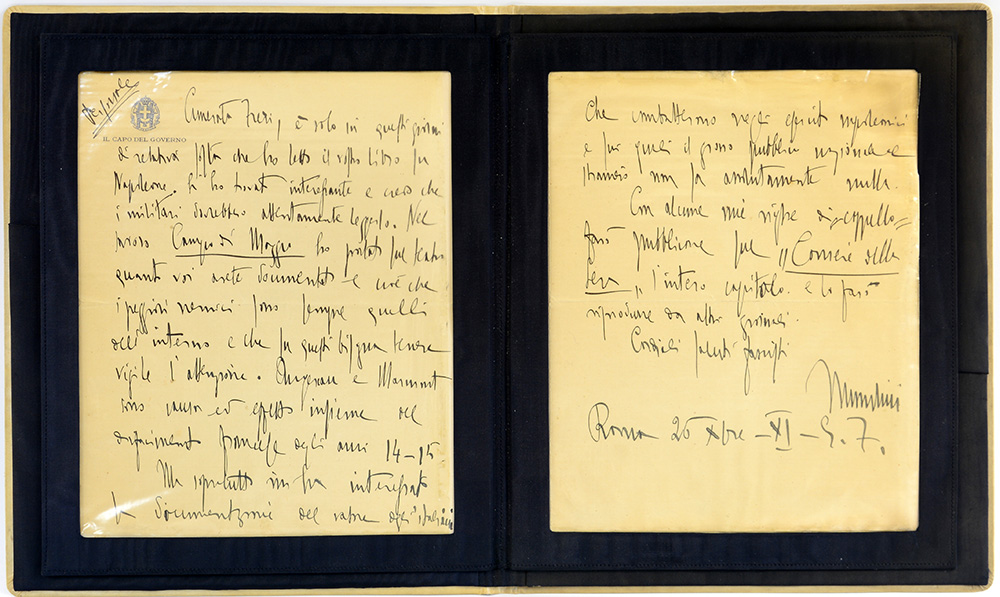 (Libri-autografi) Lettera autografa di Benito Mussolini al Generale Orlando Freri, datata 26-12-'33. Contenuta entro custodia rilegata in piena pergamena