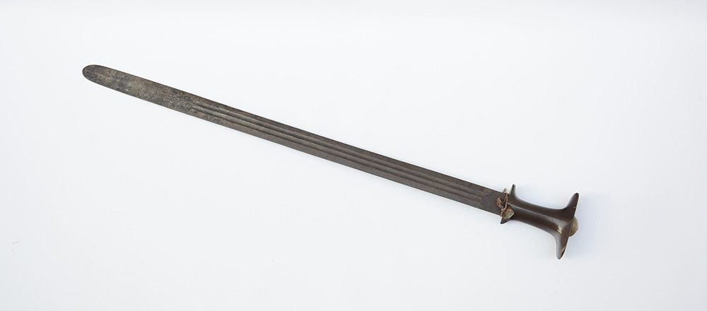 Spada etiope, lama dritta a doppio taglio con doppio scorrimento, incisa a giraglie; impugnatura a T in corno. Etiopia, II met‡ del secolo XIX