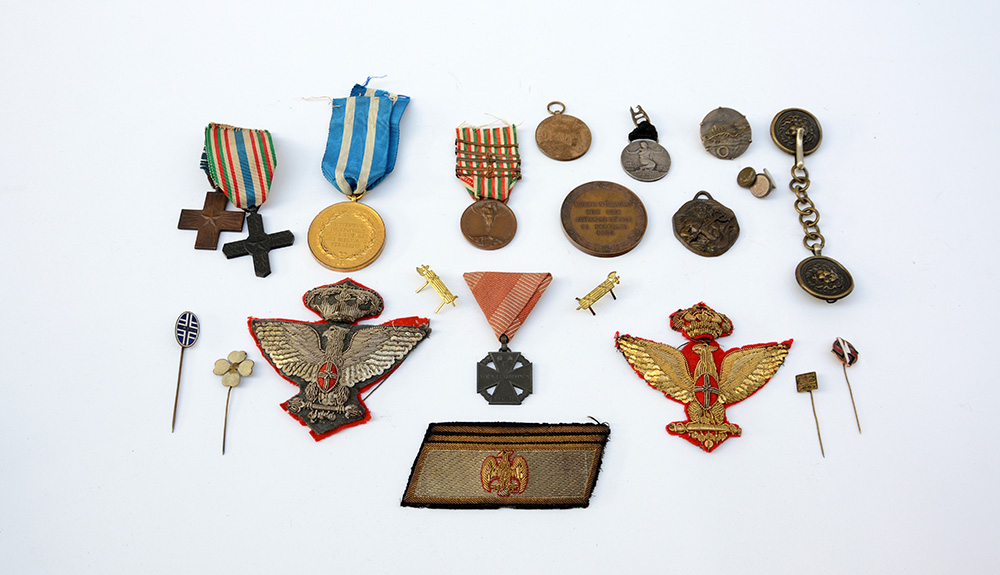 Lotto composto da: tre medaglie commemorative austriache 1915; due croci in bronzo merito di guerra del 1918; medaglia di partecipazione alla I Guerra Mondiale 1915-1918, con barrette annuali; quattro medaglie commemorative degli inizi del secolo XX; una chiusura da mantello militare, Italia inizi del secolo XX; due fregi in broderie (una dorata e una díargento) sottopannati di rosso da generale italiano, anni í20; un fregio di alto grado da fetz della milizia fascista; quattro spille da cravatta in metallo e smalti; due fasci littori in ottone dorato da mostrine