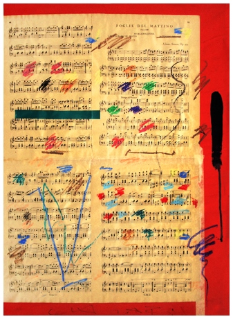 GIUSEPPE CHIARI Firenze 1926 – Firenze 2007 Senza titolo (Foglie del mattino) T.m. e collage di spartiti musicali su cartoncino 68 x 50. Firma in b. a d. Autentica dell’autore su foto. B.A.: A RICHIESTA