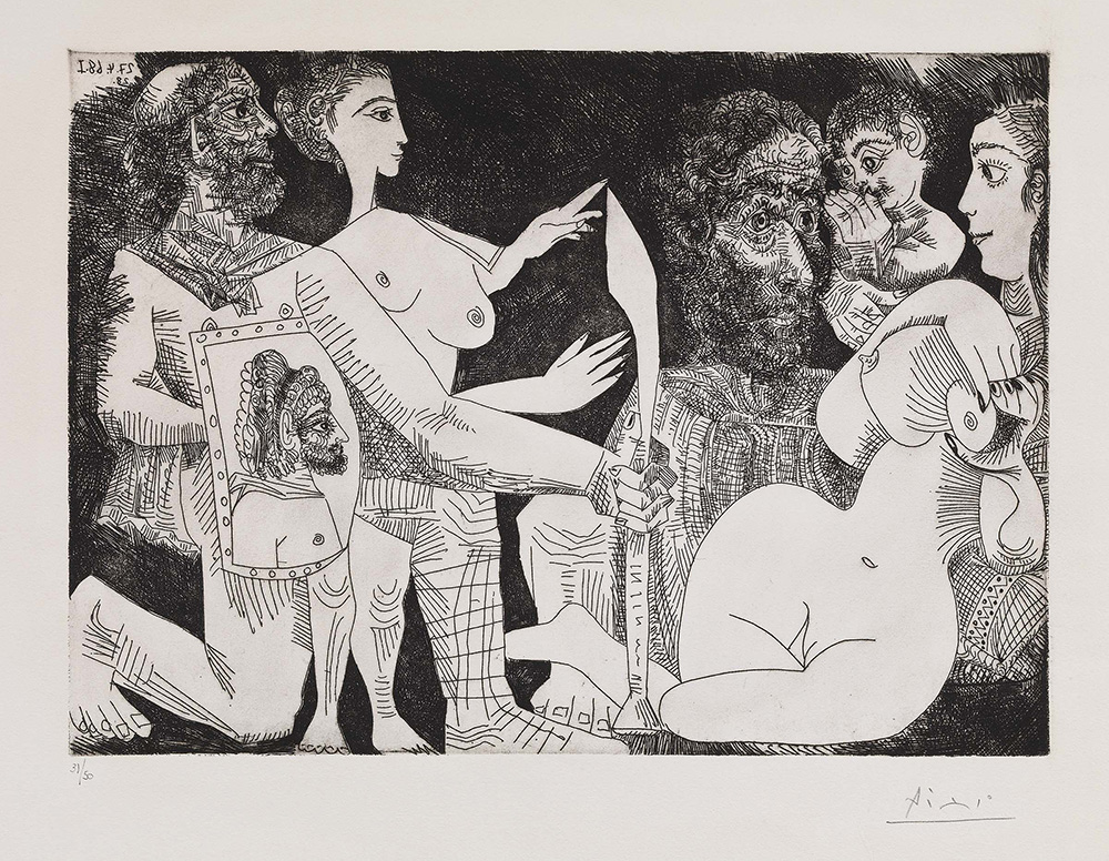 Pablo Picasso Malaga 1881 - Mougins 1973 Senza titolo, 1968 Acquaforte, es. 31/50, cm. 27,5x38,4 (lastra), cm. 45x54,6 (carta) Firma a matita sul margine in basso a destra: Picasso, tiratura in basso a sinistra: 31/50, data in lastra in alto a sinistra: 27 / 28.4.1968 I (speculare). Tiratura di 50 esemplari. Bibliografia: Georges Bloch, Pablo Picasso. Tome II. Catalogue de l'oeuvre gravé et lithographié 1966-1969, Kornfeld et Klipstein, Berne, 1971, p. 151, n. 1535