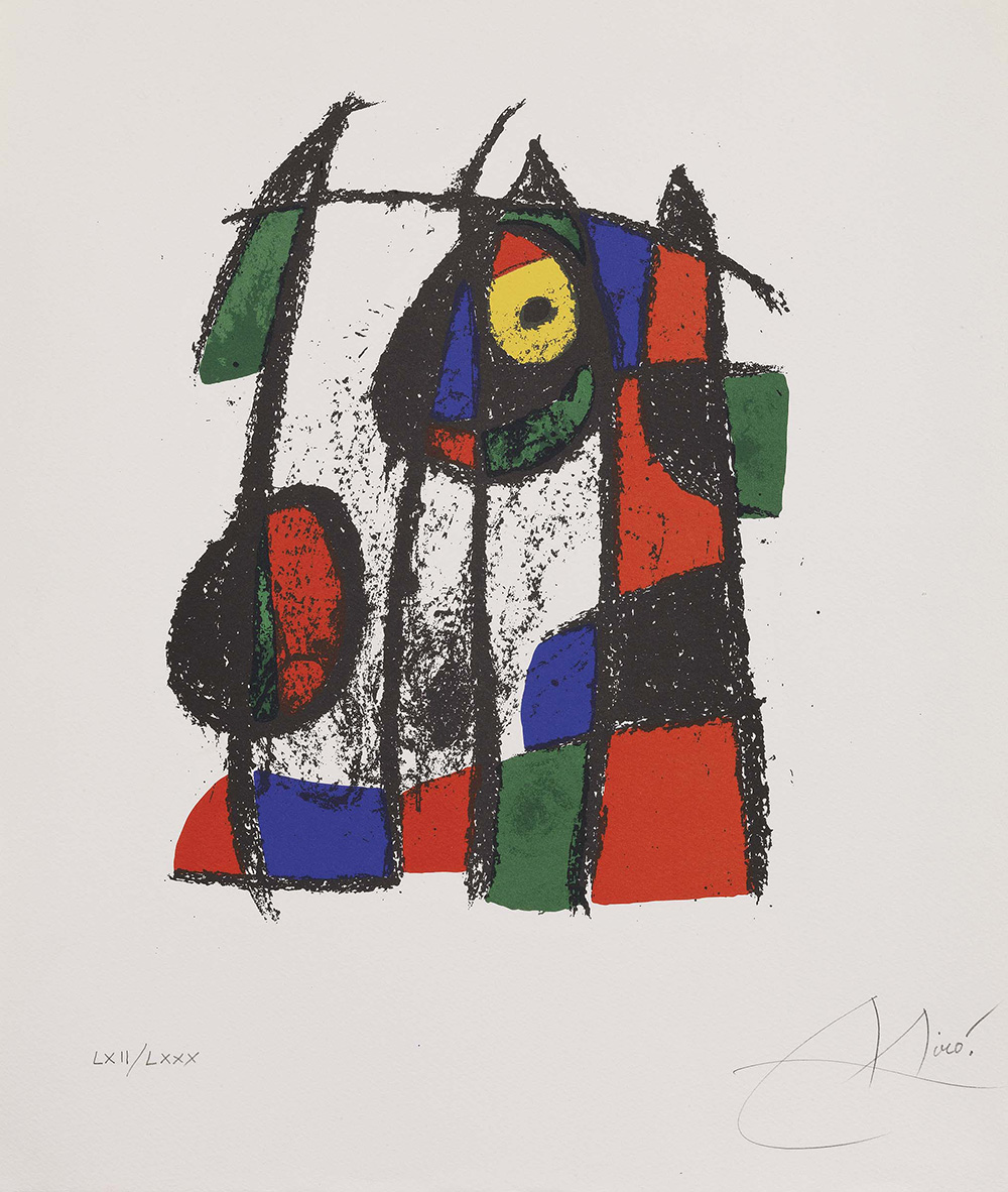 Joan Miró Barcellona 1893 - Palma di Maiorca 1983 Senza titolo, 1978 Litografia, es. LXII/LXXX, cm. 44,3x37 (carta) Firma a matita sul margine in basso a destra: Miró, tiratura in basso a sinistra: LXII/LXXX. Litografia realizzata in occasione dell'uscita del terzo volume di Miró Litógrafo, 1977; tiratura di 80 esemplari in numeri romani. Bibliografia: Joan Miró Litografo, III, 1964-1969, La Poligrafa S.A., Barcelona, 1978, p. 30