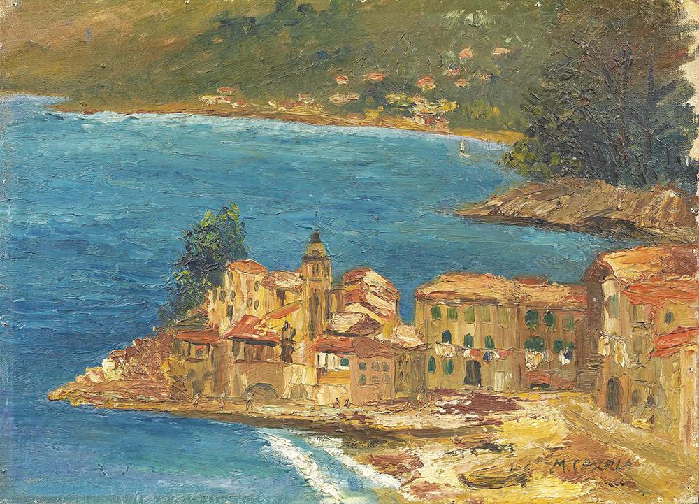 Michele Cascella Ortona (Ch) 1892 - 1989 Camogli, 1948 Olio su cartone telato, cm. 29x40 Firma in basso a destra: M. Cascella; al verso: Camogli 1948 / M. Cascella. Certificato con foto Archivio Generale dell'Opera di Michele Cascella, Milano, 21 settembre 2016, con n. 48/9