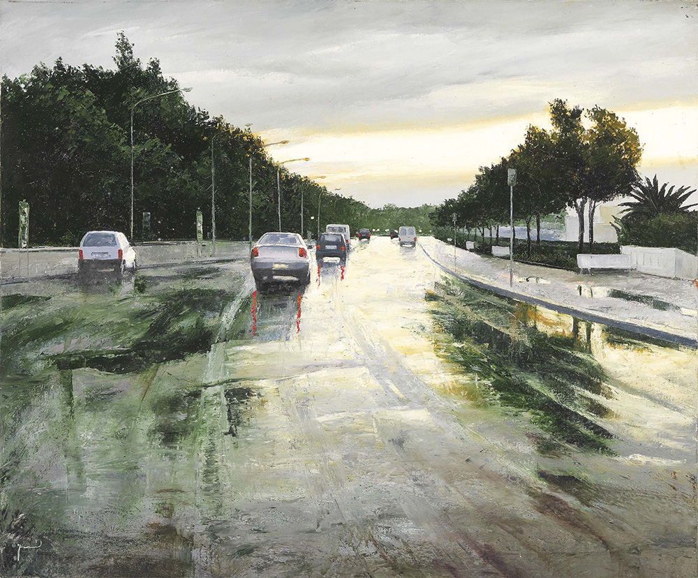 Davide Frisoni Rimini 1965 Controluce, (2002) Olio su tela, cm. 150x180 Firma in basso a sinistra: Frisoni; titolo e firma al verso sulla tela: "Controluce" / Frisoni; sul telaio: etichetta Galleria d'Arte Pegaso, Forte dei Marmi (con dati dell'opera)