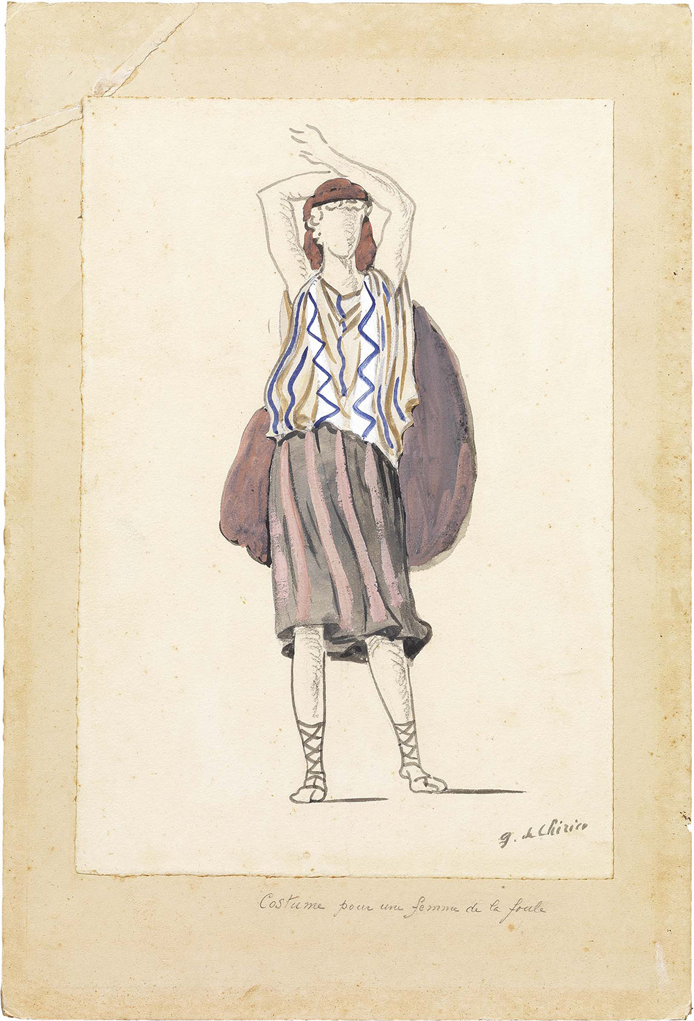 Giorgio de Chirico Volos 1888 - Roma 1978 Costume pour une femme de la foule, (1929) Tempera su carta applicata su cartone, cm. 28,7x19,5 Firma in basso a destra: G. de Chirico. Al verso: etichetta e timbro Galleria Fonte d'Abisso, Modena. Certificato su foto di Claudio Bruni Sakraischik, Roma, 14 ottobre 1986, con n. 99/86/25 (con misure errate). Esposizioni Giorgio de Chirico. Otto figurini per La morte di Niobe di Alberto Savinio, Modena, Galleria Fonte d'Abisso, 25 ottobre - 28 novembre 1980, poi Milano, Galleria Interarte, 13 gennaio - 18 febbraio 1981, illustrata a colori su una tavola fuori testo. Bibliografia Maurizio Fagiolo dell'Arco, Giorgio de Chirico / altri enigmi, opere dal 1914 al 1970, Edizioni La Scaletta, Reggio Emilia, 1983, p. 56