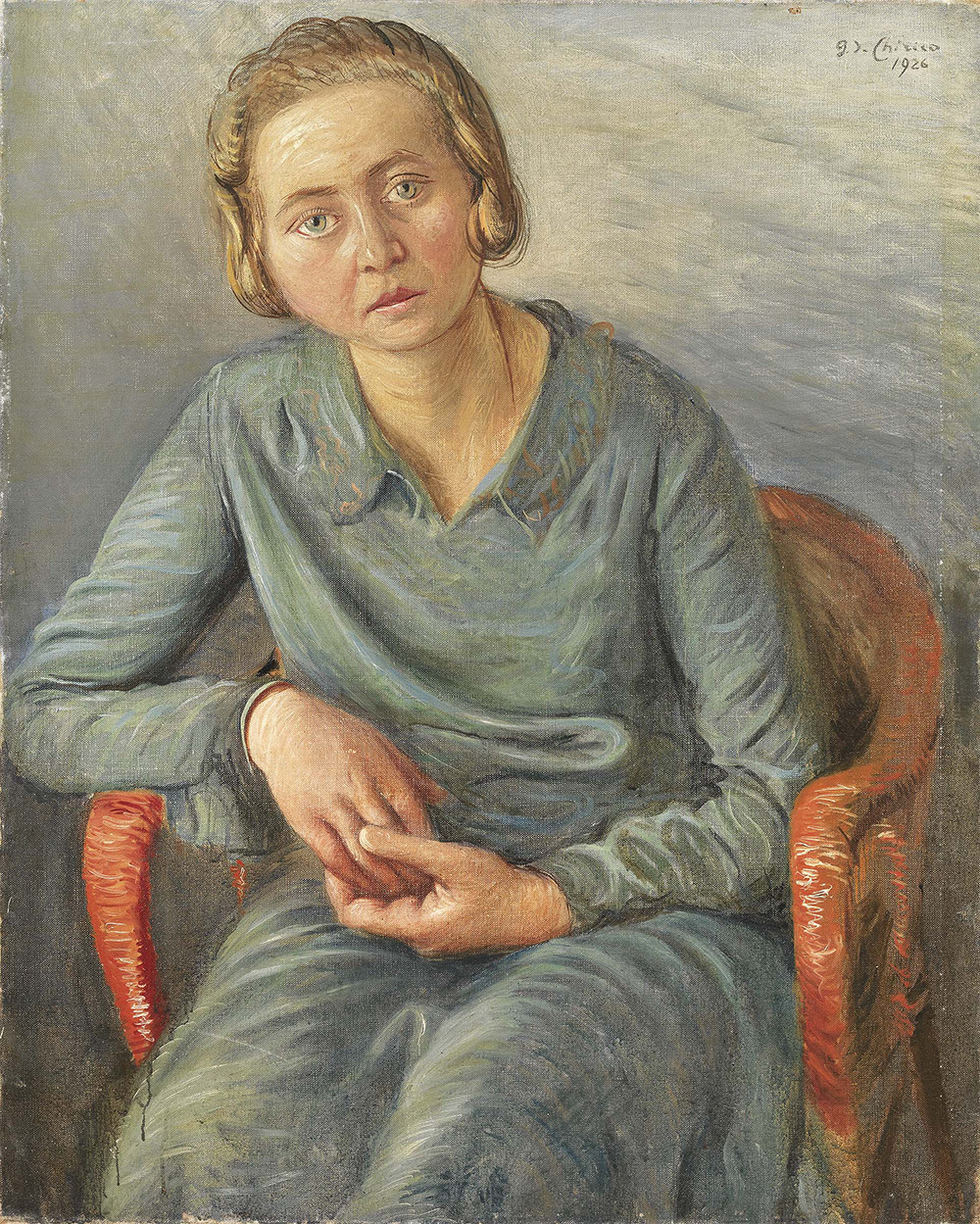 Giorgio de Chirico Volos 1888 - Roma 1978 Figura in verde (Ritratto di Raissa), 1926 Olio su tela, cm. 92x73 Firma e data in alto a destra: G. de Chirico / 1926. Al verso sulla tela: due timbri Galleria Annunciata / Milano, di cui uno con n. 3934: etichetta [Gall]eria d'Art[e] / [De]l Cavallino / Venezia; sul telaio: etichetta Galleria del Milione, Milano, con n. 1700: etichetta Galleria d'Arte del Naviglio, Milano: etichetta con n. 3934 e timbro Galleria Annunciata, Milano. Bibliografia Maurizio Fagiolo dell'Arco, Paolo Baldacci, Giorgio de Chirico. Parigi 1924-1929, dalla nascita del Surrealismo al crollo di Wall Street, Edizioni Philippe Daverio, Milano, 1982, p. 496, n. 59; Claudio Bruni Sakraischik, Catalogo Generale Giorgio de Chirico, volume ottavo, opere dal 1908 al 1930, Electa Editrice, Milano, 1987, n. 500