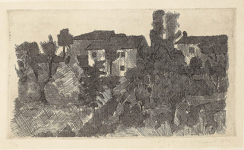 Giorgio Morandi Bologna 1890 - 1964 Il Poggio di sera, 1928 Acquaforte su zinco, es. 33/52, cm. 14x24,8 (lastra), cm. 24,2x43,2 (carta) Firma e data a matita sul margine in basso a destra: Morandi 1928, tiratura in basso a sinistra: 33/52. Stato unico, tiratura di 52 esemplari numerati di cui alcuni su carta India incollata e qualche prova. Bibliografia Lamberto Vitali, L'opera grafica di Giorgio Morandi, Giulio Einaudi Editore, Torino, 1964, n. 42; Michele Cordaro, Morandi incisioni. Catalogo Generale, Edizioni Electa, Milano, 1991, p. 49, n. 1928 2