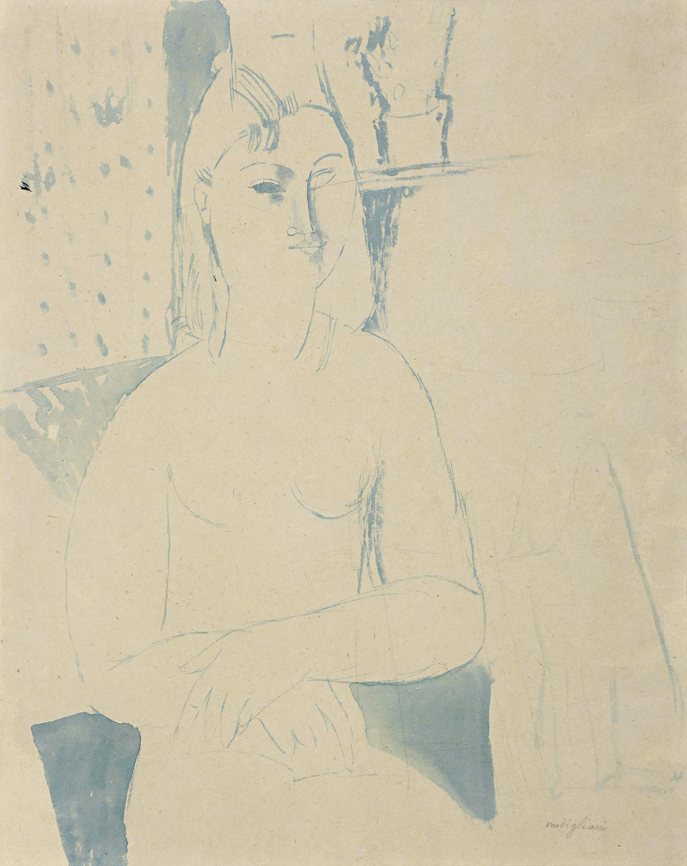 Amedeo Modigliani Livorno 1884 - Parigi 1920 Nudo di donna seduta, 1916-17 Acquerello e matita su carta, cm. 53,2x41,8 Firma in basso a destra: Modigliani. Su un cartone al retro della cornice: etichetta VI Quadriennale Nazionale d'Arte di Roma / 18 dicembre 1951 - 15 maggio 1952, con n. 35 e indicazione "Collezione Francesco Anfuso, Roma": etichetta Soprintendenza alla Galleria Nazionale d'Arte Moderna / Mostra di Pittura Italiana Contemporanea in Spagna / marzo - maggio 1955: etichetta Ente Manifestazioni Milanesi / Mostra di Amedeo Modigliani / Milano, Palazzo Reale, novembre - dicembre 1958, con n. 100: etichetta Soprintendenza alla Galleria Nazionale d'Arte Moderna / Mostra Amedeo Modigliani / gennaio - febbraio 1959. Storia Collezione Paul Guillaume, Parigi; Collezione Francesco Anfuso, Roma; Collezione privata Esposizioni VI Quadriennale Nazionale d'Arte, Roma, Palazzo delle Esposizioni, dicembre 1951 - aprile 1952, sala 73, cat. p. 179, n. 35; Mostra di Pittura Italiana in Spagna, marzo - maggio 1955; Mostra di Amedeo Modigliani, a cura di Franco Russoli, Milano, Palazzo Reale, novembre - dicembre 1958, cat. p. 37, n. 100; Amedeo Modigliani, a cura di Nello Ponente, Roma, Galleria Nazionale d'Arte Moderna, gennaio - febbraio 1959, cat. p. 55, n. 92; Aria di Parigi. Tre toscani a La Ruche, Soffici, Modigliani, Viani, a cura di Luigi Cavallo, Cortina d'Ampezzo, Galleria d'Arte Frediano Farsetti, 7 - 31 agosto 2003, poi Milano, Farsettiarte, 24 settembre - 21 ottobre 2003, cat. n. 21, illustrato a colori; Modigliani a Venezia, tra Livorno e Parigi, Venezia, Biblioteca Nazionale Marciana, 20 maggio - 5 luglio 2005, poi Cagliari, Castello di San Michele, 14 luglio - 20 ottobre 2005, cat. p. 80, illustrato a colori; Modigliani a Domodossola, da Venezia a Parigi, Domodossola, Sala Motta, 29 ottobre - 4 dicembre 2005, cat. p. 80, illustrato a colori; Artisti toscani a Parigi tra le due guerre, Cortina d'Ampezzo, Galleria d'Arte Frediano Farsetti, 28 dicembre 2006 - 7 gennaio 2007, poi Milano, Farsettiarte, 17 gennaio - 17 febbraio 2007, cat. n. 3, illustrato a colori; Modigliani. Ein mythos der moderne, a cura di Christoph Vitali, Bonn, Kunst und Ausstellungshalle der Bundesrepublik Detuschland, 17 aprile - 30 agosto 2009, cat. pp. 61, 179, n. 76, illustrato a colori; Il tempo di Modigliani, a cura di Luciano Caprile, Pescara, Museo d'Arte Moderna "Vittoria Colonna", 6 agosto - 20 novembre 2011, cat. n. 26, illustrato a colori; Ardengo Soffici. L'Europa in Toscana, a cura di Luigi Cavallo, Poggio a Caiano, Museo Soffici e del '900 italiano, Scuderie Medicee, 13 ottobre 2012 - 27 gennaio 2013, cat. p. 135, illustrato a colori; Cinquant'anni di Farsettiarte a Cortina, Cortina d'Ampezzo, Farsettiarte, 9 - 31 agosto 2014, cat. n. 20, illustrato a colori; Modigliani. Legend of Montparnasse, Seoul, Seoul Arts Center, Hangaram Art Museum, 26 giugno - 4 ottobre 2015, cat. p. 191, illustrato a colori. Bibliografia Enzo Carli, Amedeo Modigliani, con una testimonianza di Jean Cassou, De Luca Editore, Roma, 1952, p. 35, n. 35, tav. 36; Joseph Lanthemann, Modigliani 1884-1920. Catalogue raisonné, sa vie, son oeuvre complete, son art, Gráficas Condal, Barcellona, 1970, n. 721 (con titolo «Femme assise de face» e data 1915); Christian Parisot, Modigliani. Catalogue raisonné - dessins, aquarelles - Tome I, testi di C. Parisot, J. Modigliani, F. Venturi, Editions Graphis Arte, Livorno, 1990, pp. 275, 346, n. 30/15 (con titolo «Femme assise de face», data 1915 e misure cm. 53x49); Osvaldo Patani, Amedeo Modigliani catalogo generale, disegni 1906-1920, Leonardo Editore, Milano, 1994, p. 174, n. 280