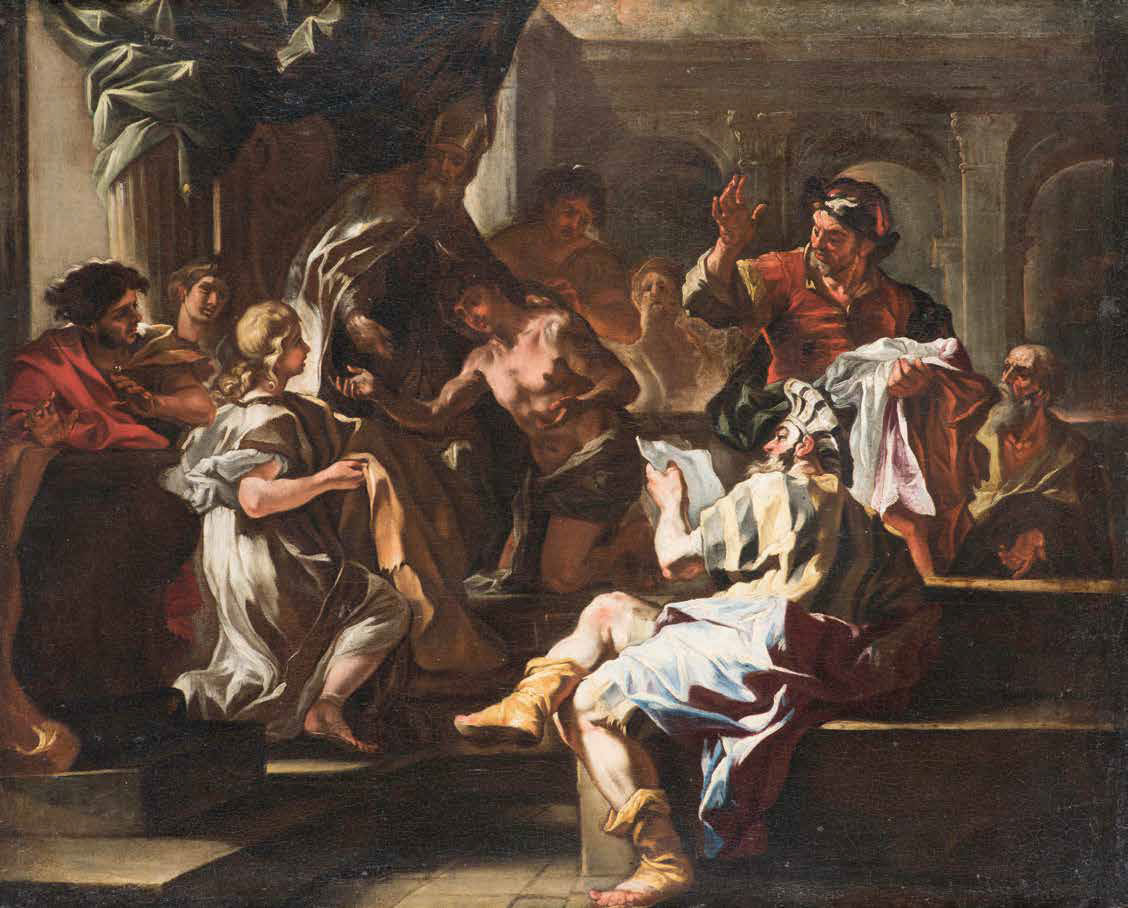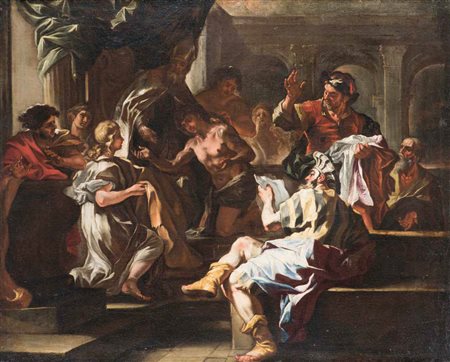 Francesco Solimena Canale di Serino 1657 – Barra 1747 SAN FRANCESCO RINUNCIA AI BENI PATERNI olio su tela, cm 62x76. Iscrizione al verso sulla tela: quando s. Francesco d’asissi rinonzio li beni paterni e prese l’abito, modelo, fato da F.co Solimena in Napoli per il Sig. David Fossati amico del sig. Casimiro Queloni a Ve(ne)zia Provenienza: Collezione privata Bibliografia: N. Spinosa (a cura di), Pittura del Seicento a Napoli. Da Mattia Preti a Luca Giordano. Natura in Posa, Prismi Editrice Politecnica Napoli Srl, Napoli 2011, n. 193, p. 224 (ill. b/n); S. Carotenuto, Francesco Solimena. Dall’attività giovanile agli anni della maturità (1674-1710), in “Arte e Ricerca”, Anno I, n. 1, Edizioni Nuova Cultura, Roma 2015, n. A21.4, p. 147 (ill.). Il dipinto si riferisce ad una delle scene affrescate da Solimena nel Coro della chiesa barocca di Santa Maria Donnaregina a Napoli, distrutto in parte tra il 1928 e il 1934 per riportare alla luce l’abside della preesistente chiesa gotica. L’intero ciclo fu commissionato al pittore poco più che ventenne come documentano le date dei primi pagamenti elargiti al pittore (24 gennaio 1684) ma si presume che l’inizio dei lavori risalga almeno a un paio di anni prima e quindi collocabile tra il 1681 e il 1684.(cfr. S. Carotenuto, op. cit.). Il ciclo pittorico di Donnaregina rappresenta l’affermazione di Solimena nella scena artistica napoletana grazie alla sua fine rielaborazione dei modi di Luca Giordano. La tela qui presentata potrebbe essere un bozzetto o una replica autografa del grande affresco (cfr. N. Spinosa, op. cit.). Ad oggi si conosce un’altra versione dello stesso soggetto conservata presso il Museo di Chalon sur Saône (cfr. F. Bologna, Francesco Solimena, L’arte tipografica, Napoli 1958, fig. 48, pp. 62, 250). Il grande ciclo pittorico si caratterizza per soluzioni di grande impatto pittorico, dalle cromie solari e squillanti che ricordano i grandi capolavori di Luca Giordano da un lato, e Pietro da Cortona dall’altro. L’affresco a cui l’opera si riferisce è pubblicato da Ferdinando Bologna, opera in cui lo studioso riconduce la produzione della prima maturità di Solimena agli influssi, oltre che di Luca Giordano e Pietro da Cortona, anche di Giovanni Lanfranco (cfr. F. Bologna, op. cit., figg. 49-50).