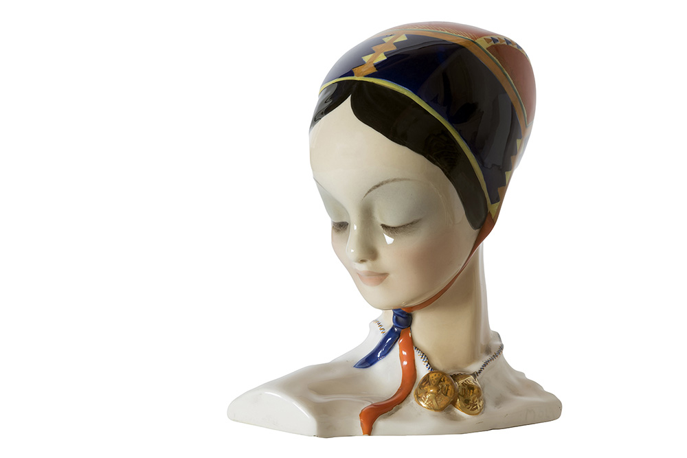ALESSANDRO MOLA Testina desulese, 1940 Ceramica dipinta, h 22 cm Firma in basso a destra: Mola Marchio sotto la base: Essevi Cagliari 2. 4. 40 A Torino il ceramista sardo collabora con la manifattura ‘Lenci’ e con Sandro Vacchetti alla manifattura ‘Essevi’ producendo piccole sculture femminili in costume sardo CONDITION REPORT Piccola sbeccatura in basso a destra