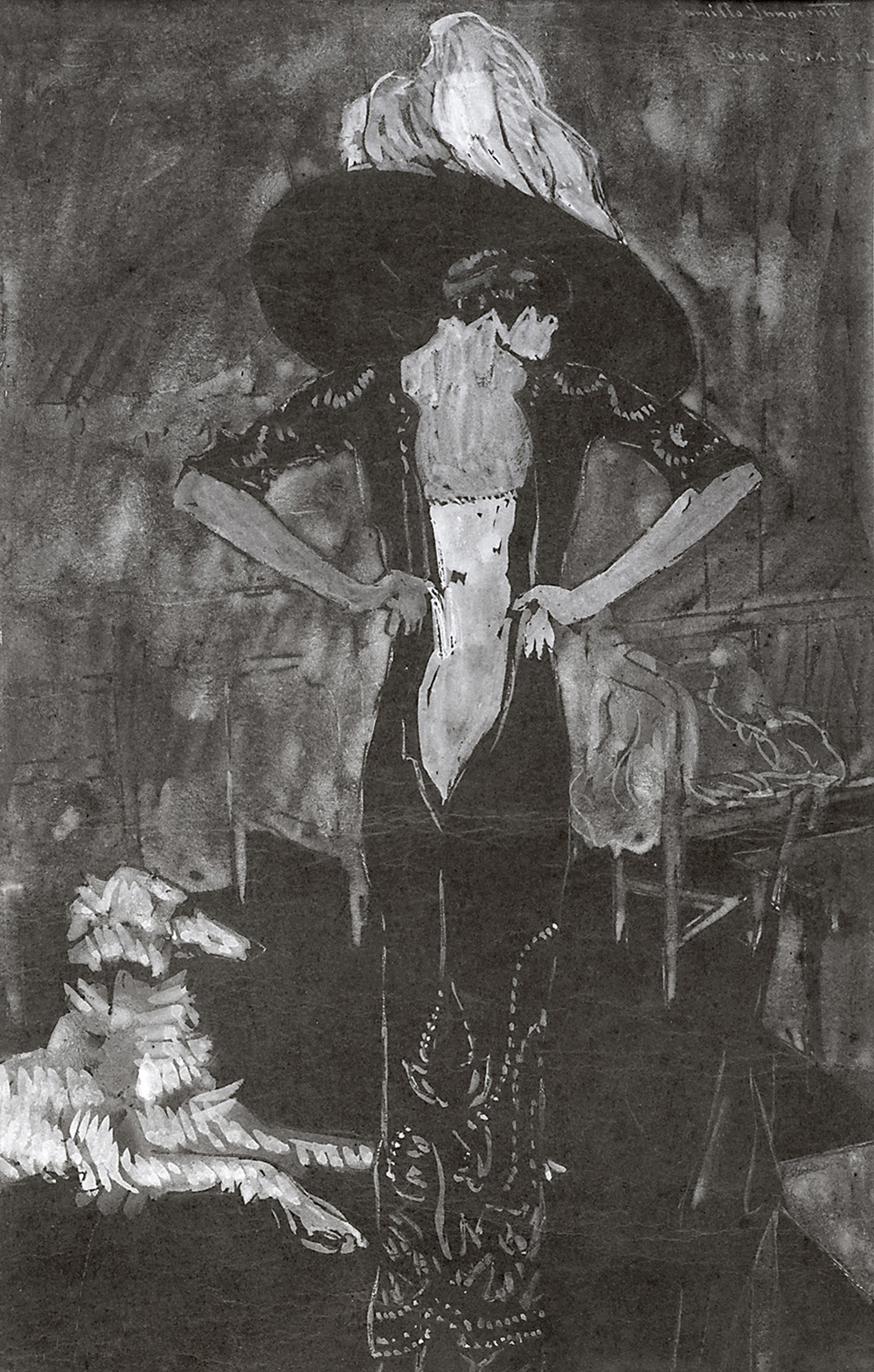 CAMILLO INNOCENTI Signora col levriero, 1912 Acquerello a biacca si carta, 48 x 31 cm Firma e data in alto a destra: Camillo Innocenti / Roma, 29. X. 1912 ESPOSIZIONI E PUBBLICAZIONI Disegno italiano 1900 - 1960, Archivio Arco Farnese, Roma 1991, cat. n.49