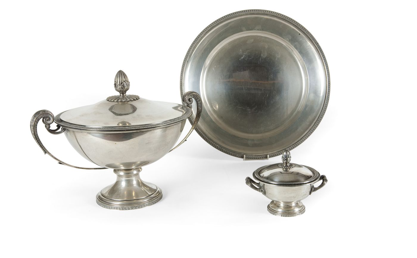 LOTTO DI TRE OGGETTI IN ARGENTO Lotto composto da una grande zuppiera con coperchio, un piatto in argento in stile Impero e una zuccheriera con coperchio Peso gr. 3.760