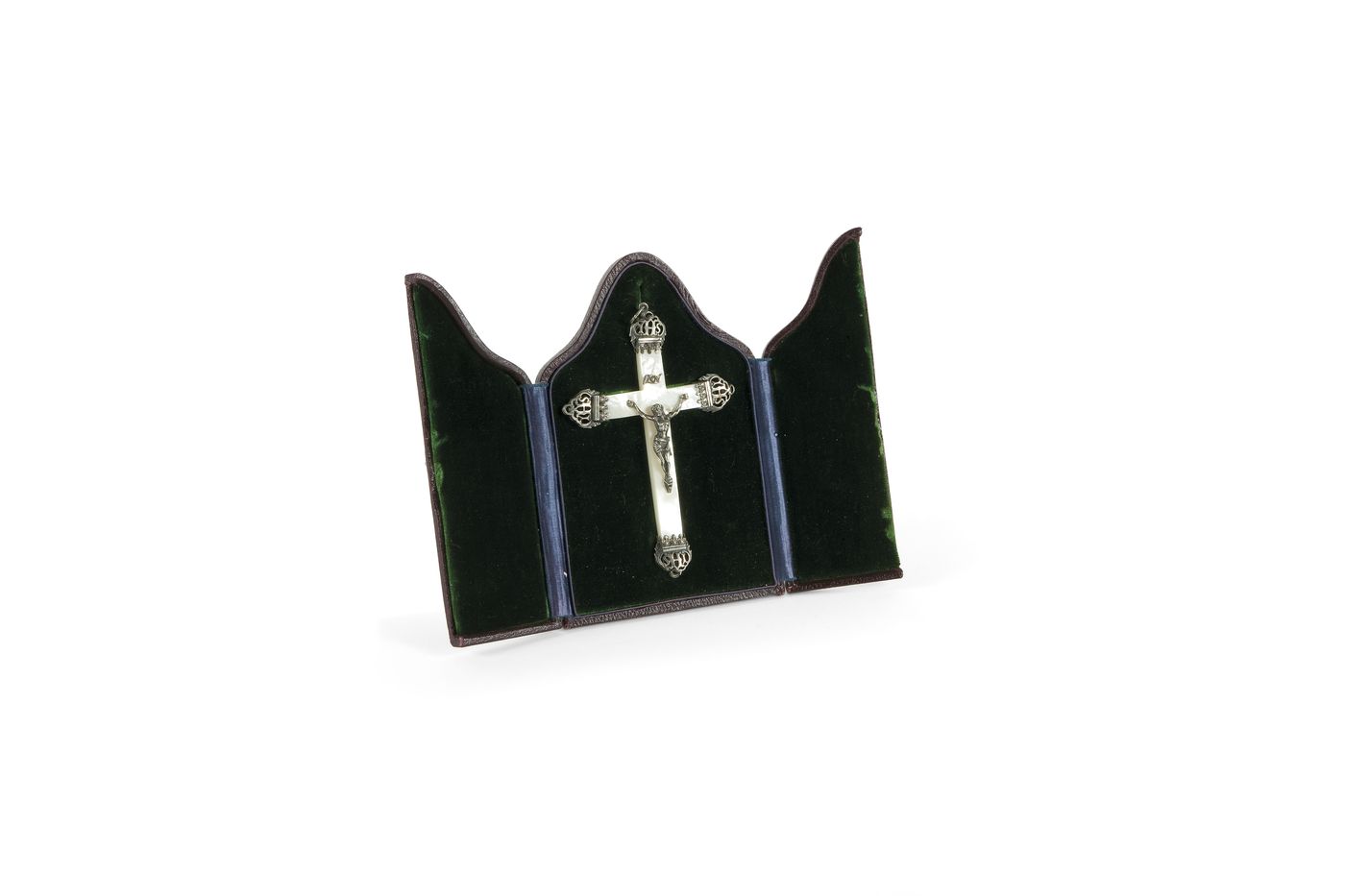 CROCIFISSO Crocifisso in madreperla ed argento, entro scatola. Punzone non identificato. Epoca, XIX secolo h cm 10