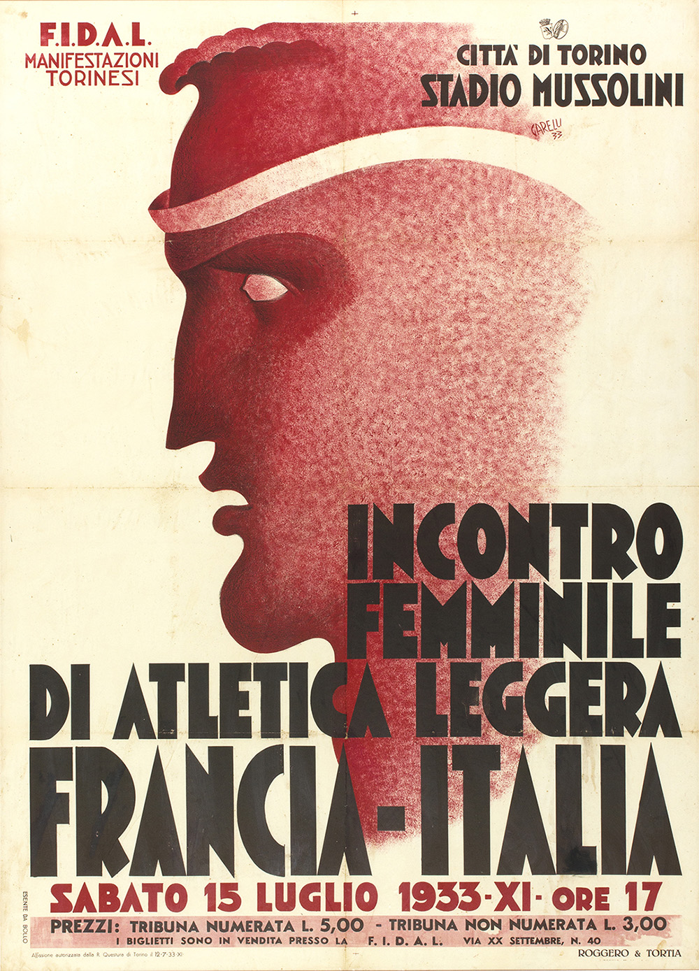 FRANCO GARELLI Manifesto Italia Francia - Incontro femminile di altetica leggera, 1933 Stampa su carta, 135 x 97 cm Firma e data in alto a destra: Garelli 33