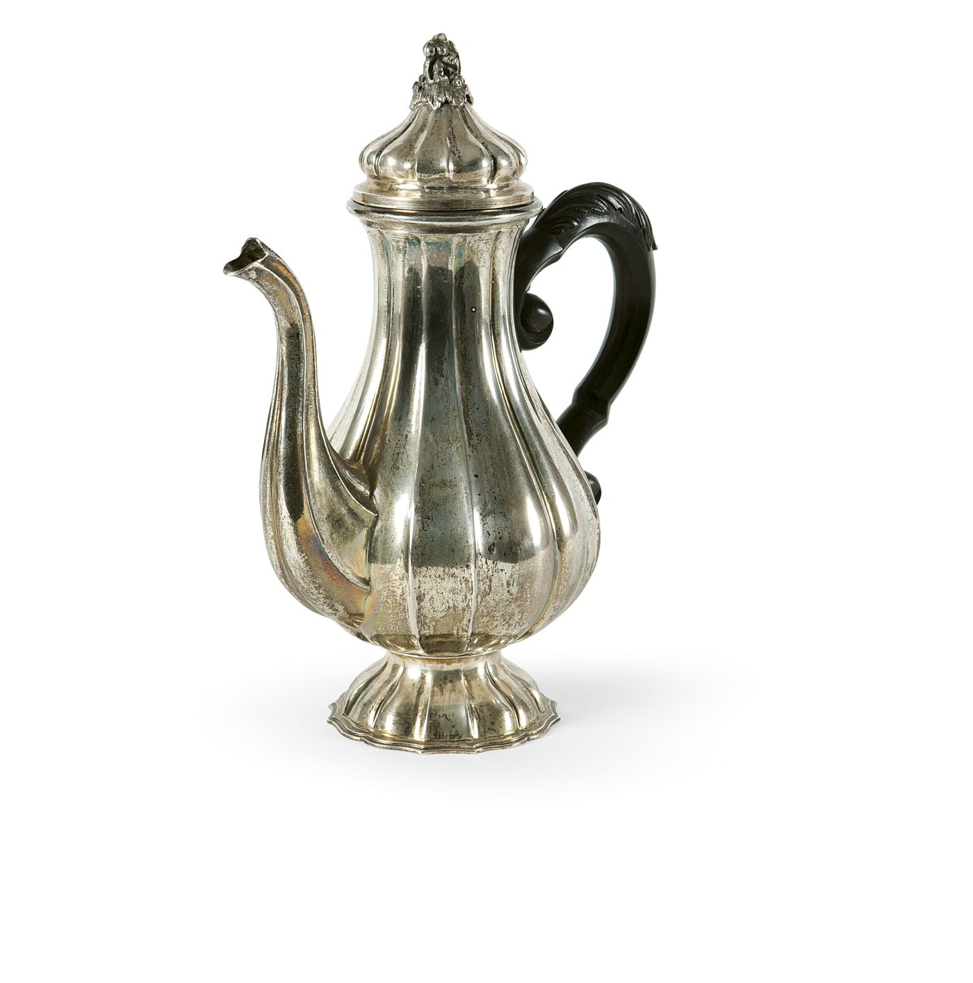 CAFFETTIERA IN ARGENTO Caffettiera in argento, in stile barocco. Manico in legno ebanizzato. Venezia, fine XIX secolo inizio XX secolo Peso gr 492 h cm 22,5