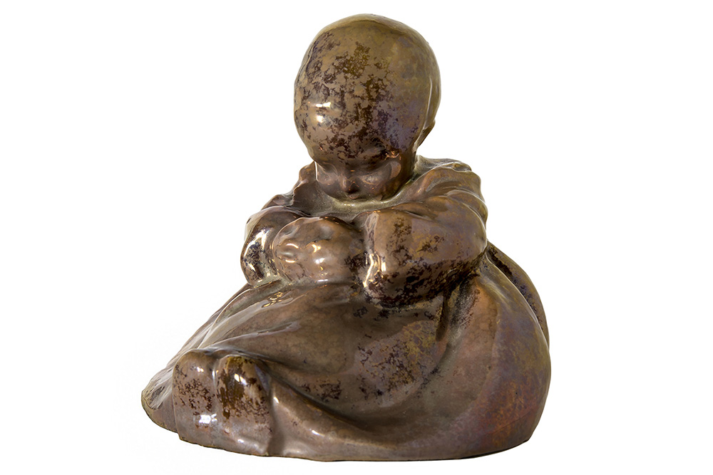 PIETRO MELANDRI Bimba seduta con pomo, 1922-31 Ceramica dipinta e iridata, h 12 cm All’interno marchio della ditta Fratelli Minardi (MF) di Melandri - Focaccia con Astorre in mezzo Realizzata su disegno di Domenico Baccarini del 1903 circa Si veda per confronto: Domenico Baccarini, catalogo della mostra, a cura di Claudio Spadoni, Electa 2007, p. 187