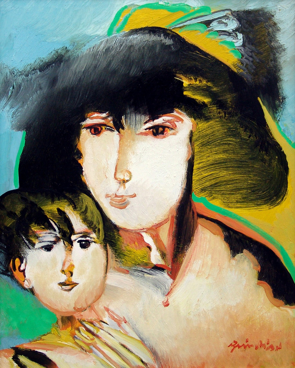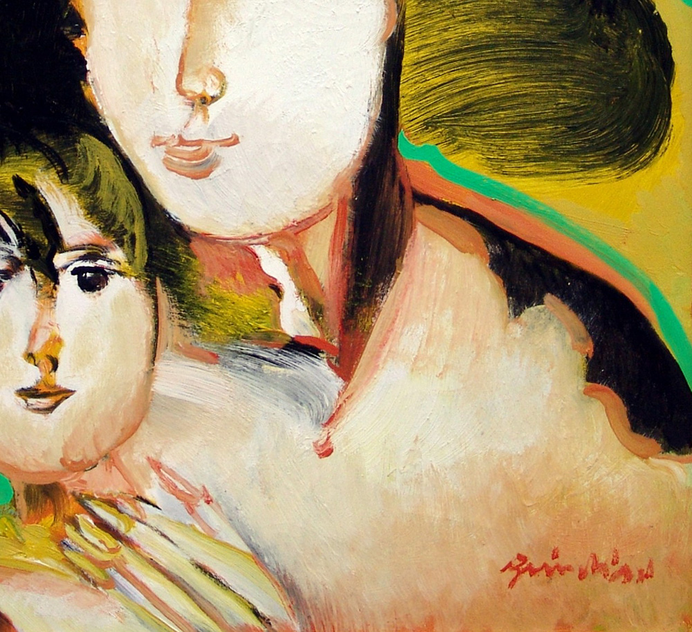 Remo Brindisi 1918, Roma (Rm) - 1996, Lido di Spina (Fe) - [Italia] Maternità olio su tela 50x40 cm c. 1980 firma dell’artista in basso a destra e sul retro; opera con cornice certificato di autenticità a cura di Gimmi Stefanini; opera pubblicata nel catalogo generale delle opere di Remo Brindisi "Galleria Pace" con n. repertorio 4712