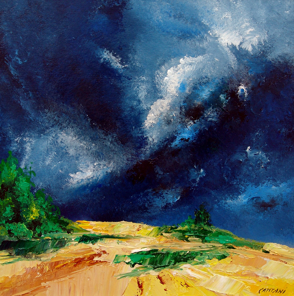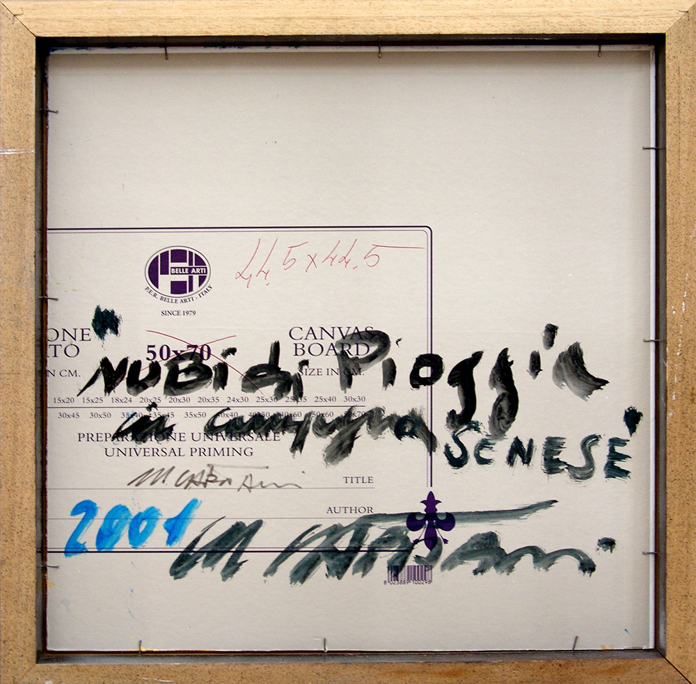 Mauro Capitani 1949, San Giovanni Valdarno (Ar) - [Italia] Nubi di pioggia in campagna senese olio su tavola telata 44,5x44,5 cm 2001 firma dell’artista in basso a destra e sul retro; opera con cornice certificato di autenticità dell'artista su foto